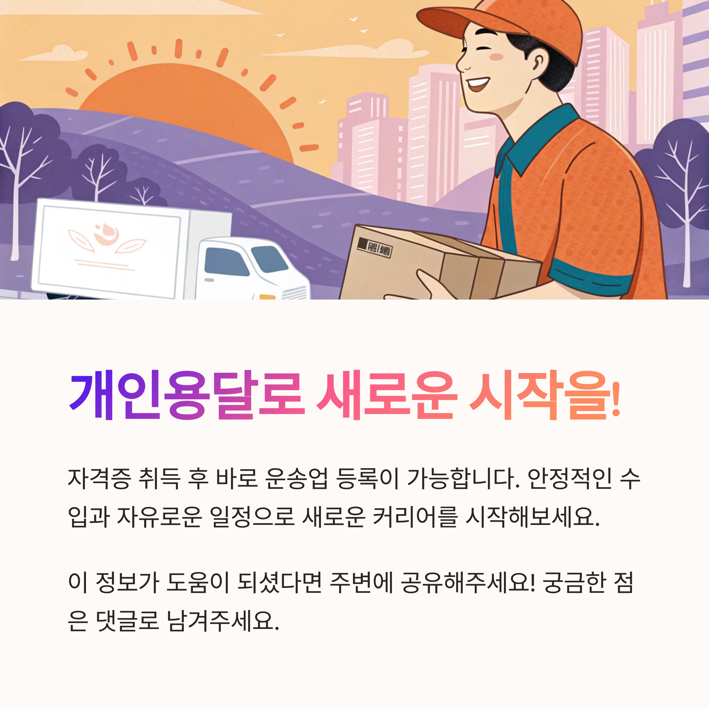 | 개인용달 | 화물운송종사자격증 | 1톤 트럭 등 | 전국 | 자가 소유 필수 |
