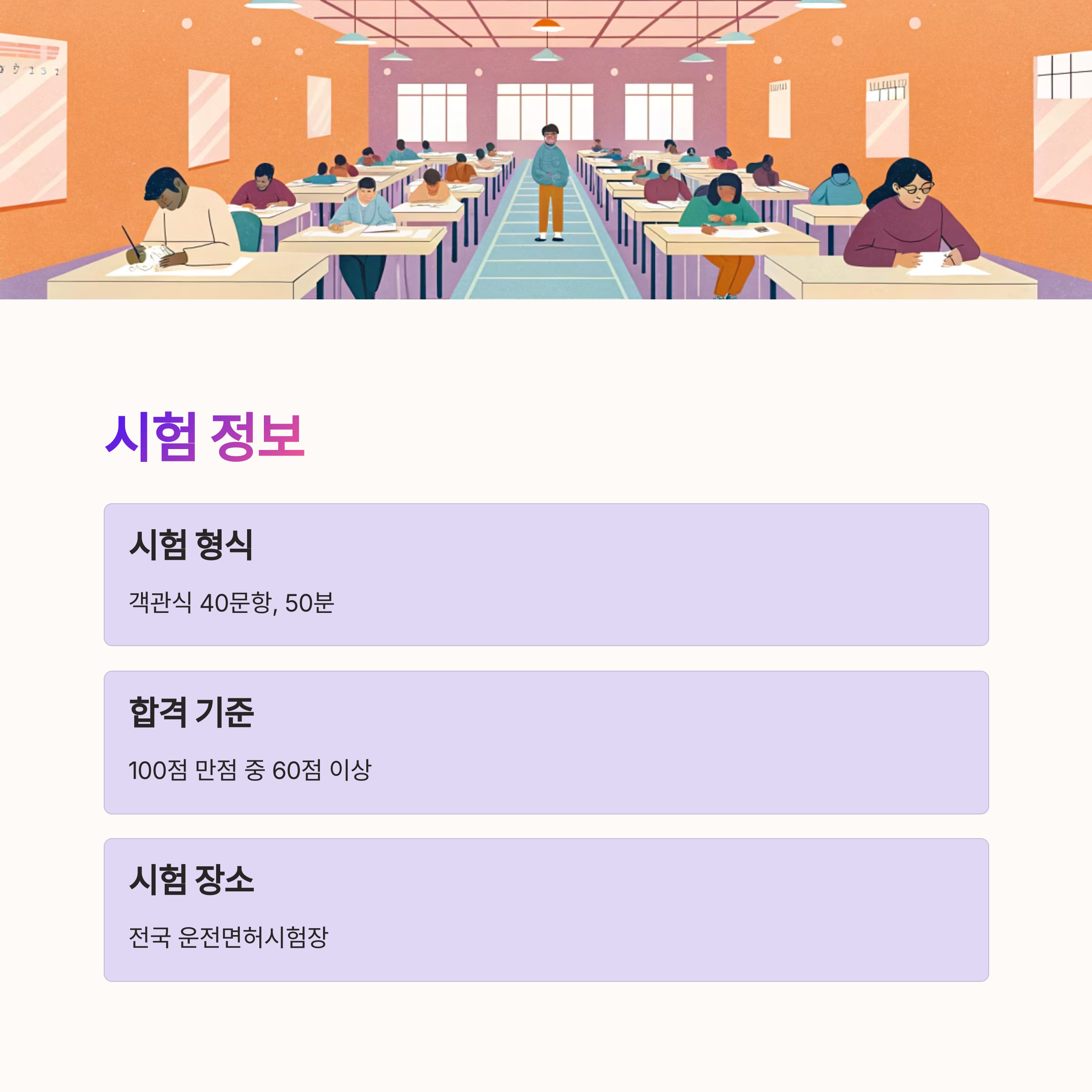 A3. 객관식 40문항으로 구성되어 있고, 100점 만점에 60점 이상이면 합격이에요. 시험 시간은 50분이에요.