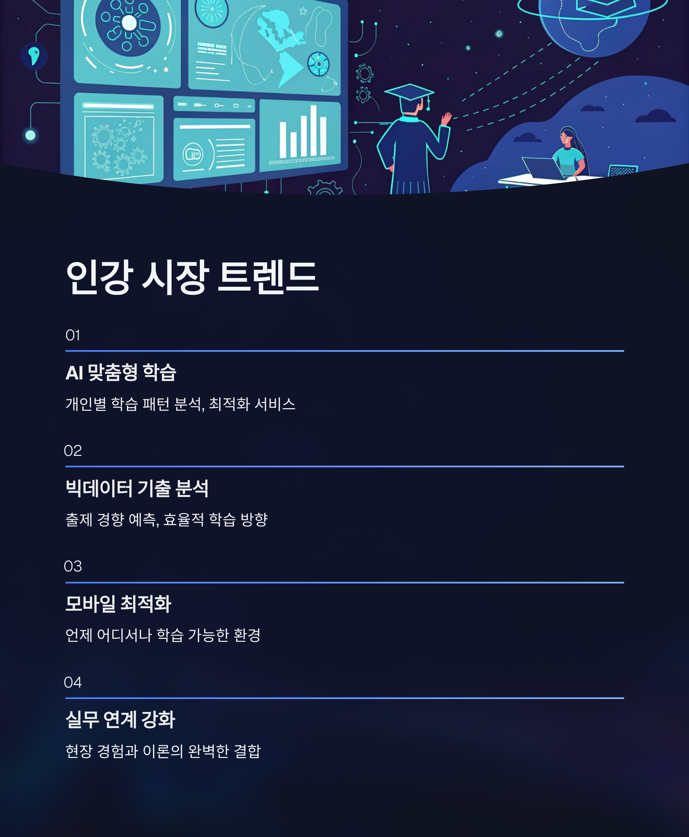2025년 현재, 인강 시장은 AI 기반 맞춤형 학습과 빅데이터를 활용한 기출 분석이 눈에 띄어요. 또, 모바일 최적화 서비스가 강화되면서 언제 어디서든 학습할 수 있는 환경이 마련됐어요. 실무와 연계된 강의도 점점 늘어나고 있어요.