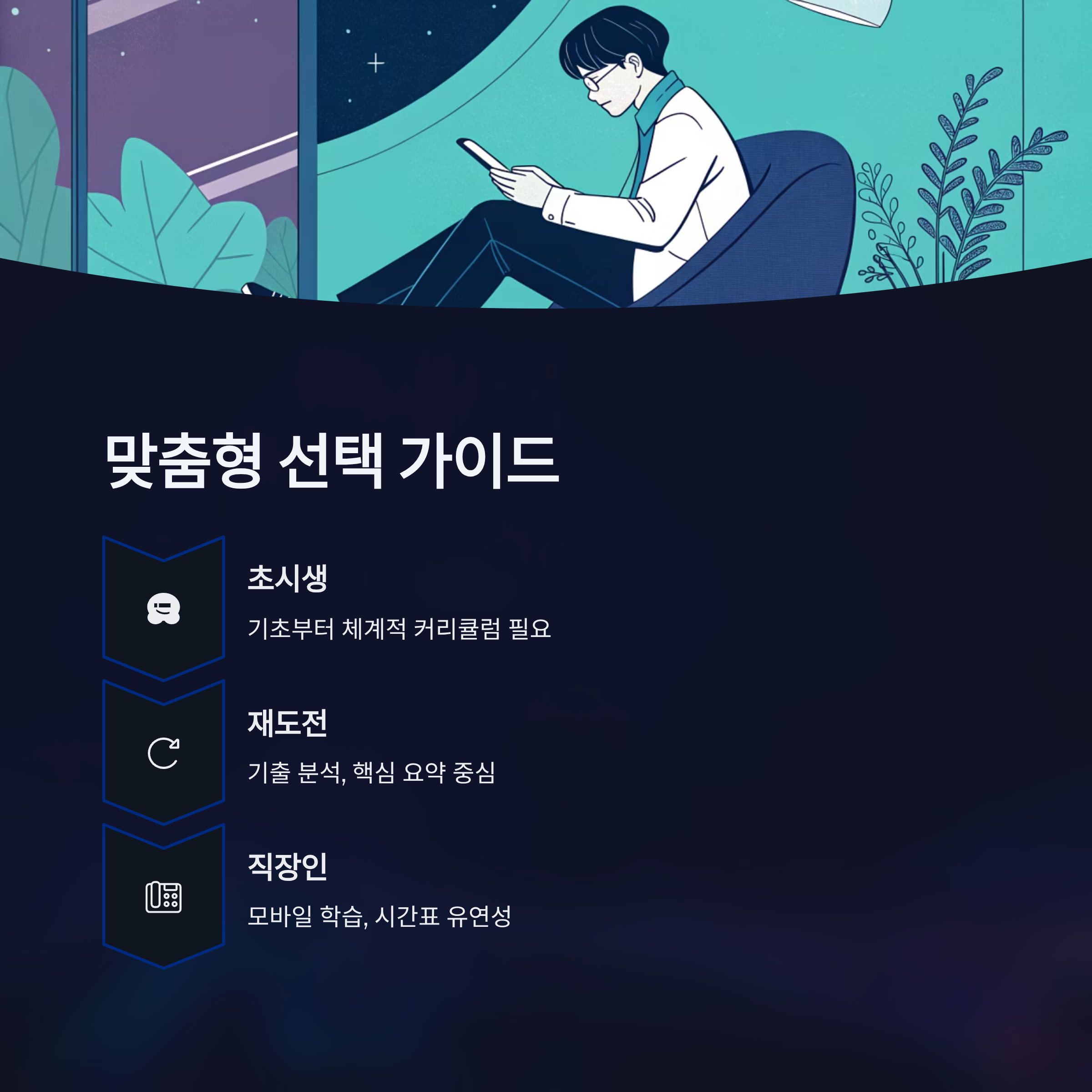 초시생이라면 기초부터 체계적으로 배울 수 있는 커리큘럼을 가진 강의를 추천해요. 반면 재도전 수험생은 기출 문제 분석과 핵심 요약 중심 강의를 선택하는 게 효과적이에요. 직장인 수험생이라면 모바일 학습 지원과 시간표 유연성이 중요한 기준이 될 수 있어요.