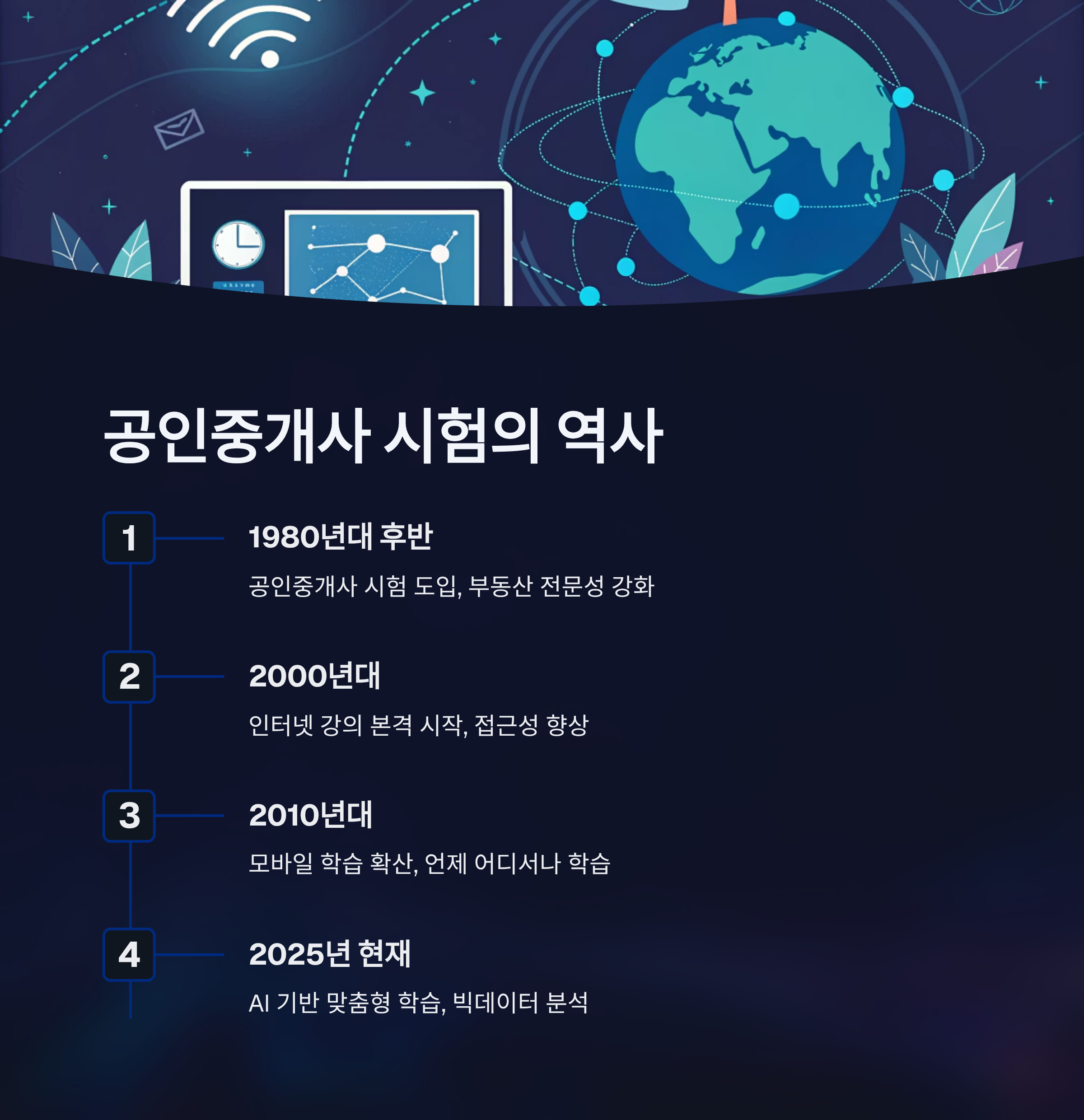 공인중개사 시험은 1980년대 후반 도입되었고, 부동산 거래의 전문성을 강화하기 위해 시작되었어요. 초기에는 오프라인 학원이 중심이었지만, 2000년대 들어 인터넷 강의가 본격적으로 자리 잡았답니다. 덕분에 지역과 시간에 구애받지 않고 누구나 시험 준비가 가능해졌어요.