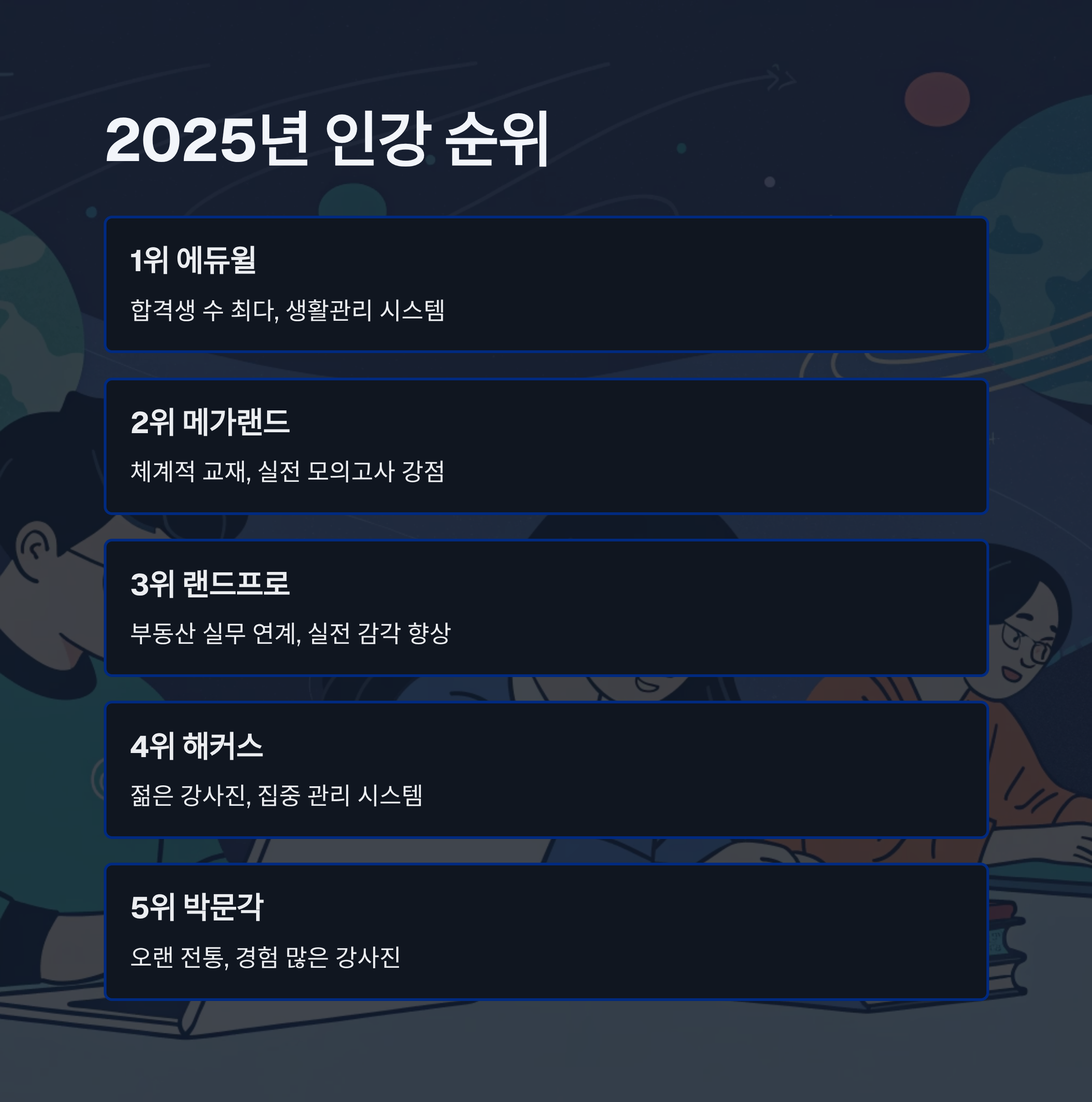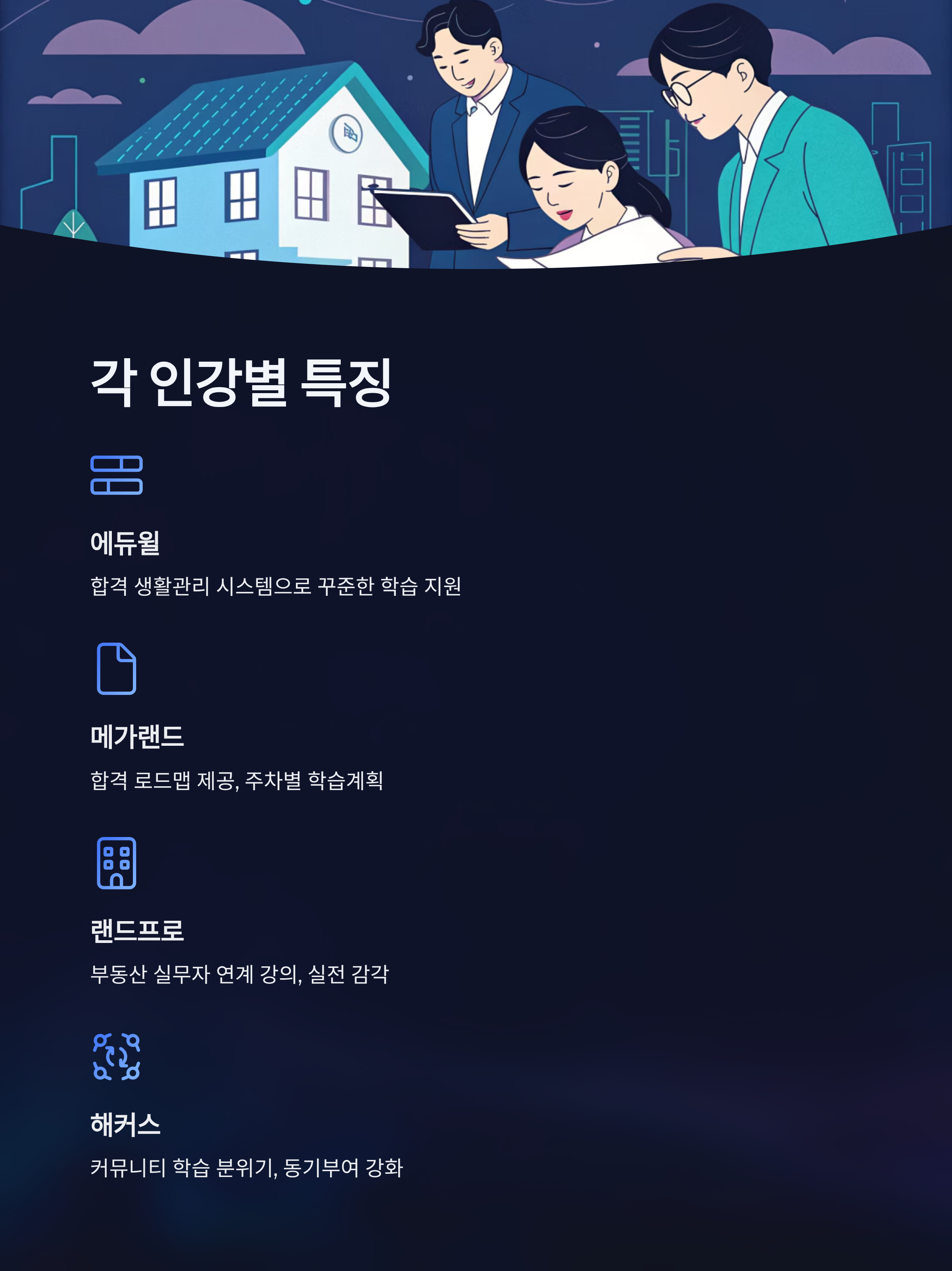 예를 들어 에듀윌은 합격생 수에서 두각을 나타내고, 메가랜드는 체계적 교재와 실전 모의고사가 강점이에요. 랜드프로는 부동산 실무 연계 강의로 차별화되고, 해커스는 젊은 강사진과 집중 관리 시스템으로 인기를 끌고 있죠.