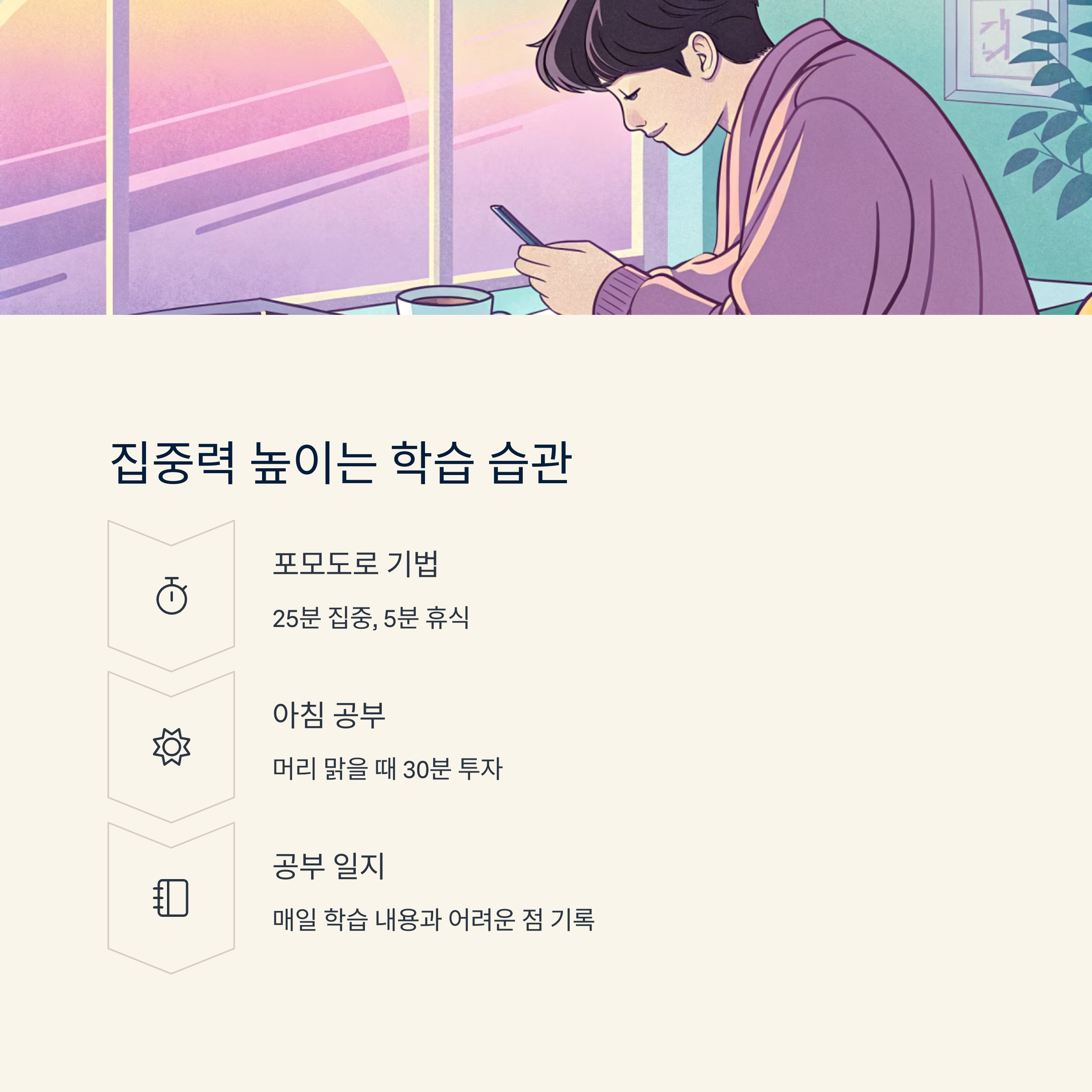 공부를 오래 해도 집중이 안 된다면 시간만 낭비하게 돼요. 그래서 '25분 집중, 5분 휴식'의 포모도로 기법이 정말 유용해요. 특히 암기 과목에 잘 어울려요.