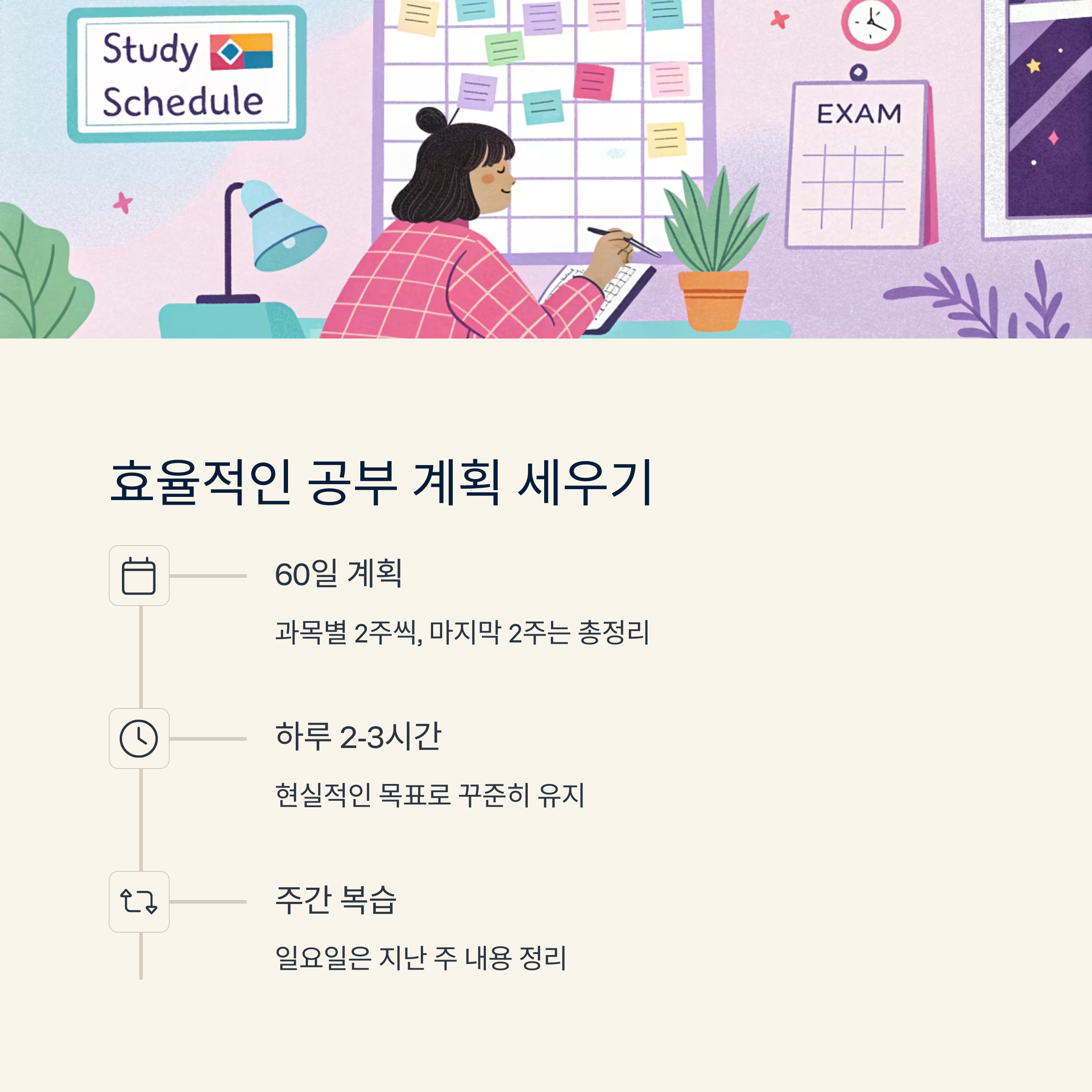 공부 계획을 세울 땐 전체 시험일까지 남은 기간을 기준으로 과목별 분량을 나누는 게 좋아요. 예를 들어 60일이 남았다면 각 과목에 2주씩, 마지막 2주는 총정리로 배치해보세요.