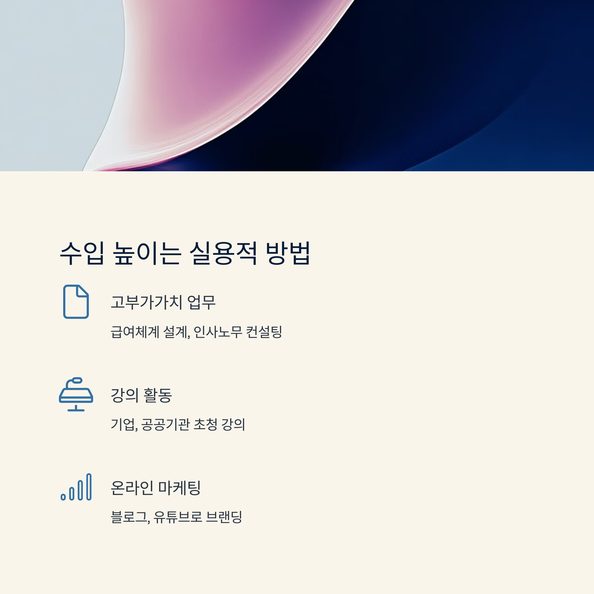 또한 강의나 교육 프로그램을 운영하면 전문성을 알릴 수 있는 동시에 부가 수익도 생겨요. 기업 연수원, 공공기관, 대학에서의 초청 강의도 점차 늘어나는 추세랍니다.