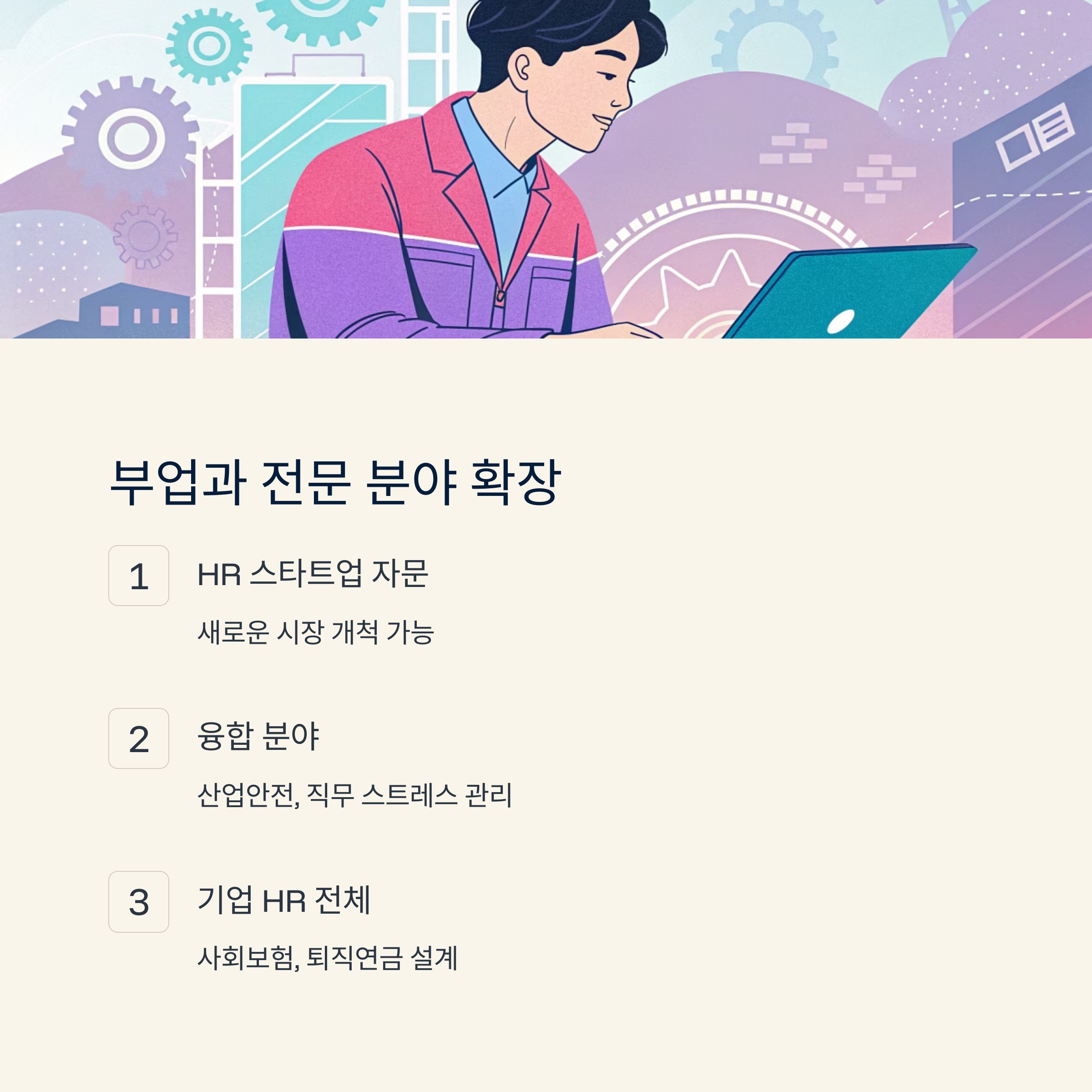 또한 산업안전, 산업보건, 직무 스트레스 관리 같은 융합 분야는 기업 수요가 점점 증가하고 있어요. 노무사로서 이런 연계 분야까지 공부하면 새로운 시장을 개척할 수 있답니다.
