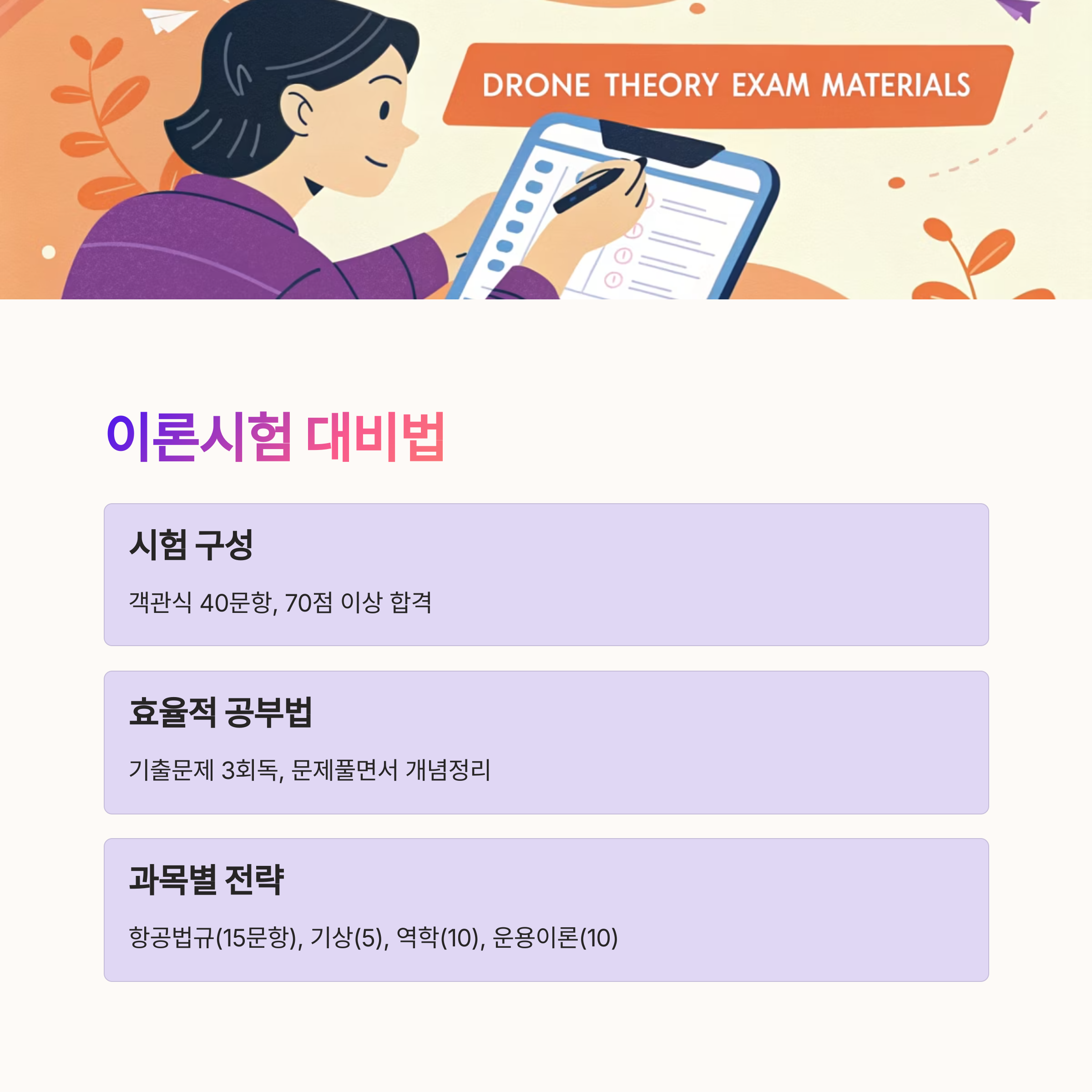 드론 필기 시험은 객관식 40문항으로 구성되며, 합격 기준은 70점 이상이에요. 과목은 항공법규, 항공기상, 항공역학, 운용이론 네 가지로 나뉘죠. 처음 듣는 생소한 단어가 많아서 처음엔 어렵게 느껴질 수 있어요.