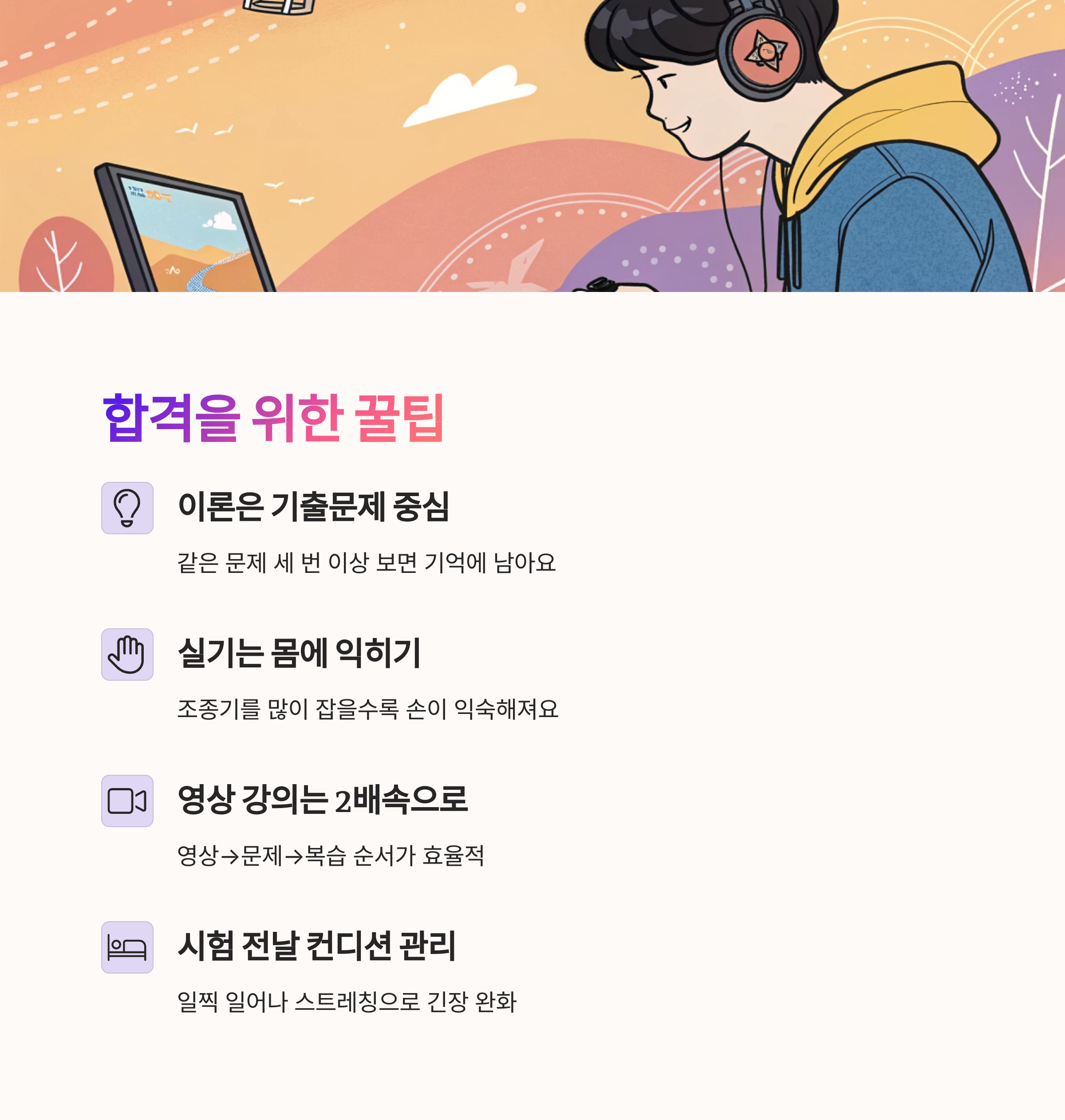 실기에서 가장 중요한 건 '침착함'이에요. 실전처럼 연습해두면 시험 당일 긴장감도 줄고, 자연스럽게 손이 움직일 거예요!