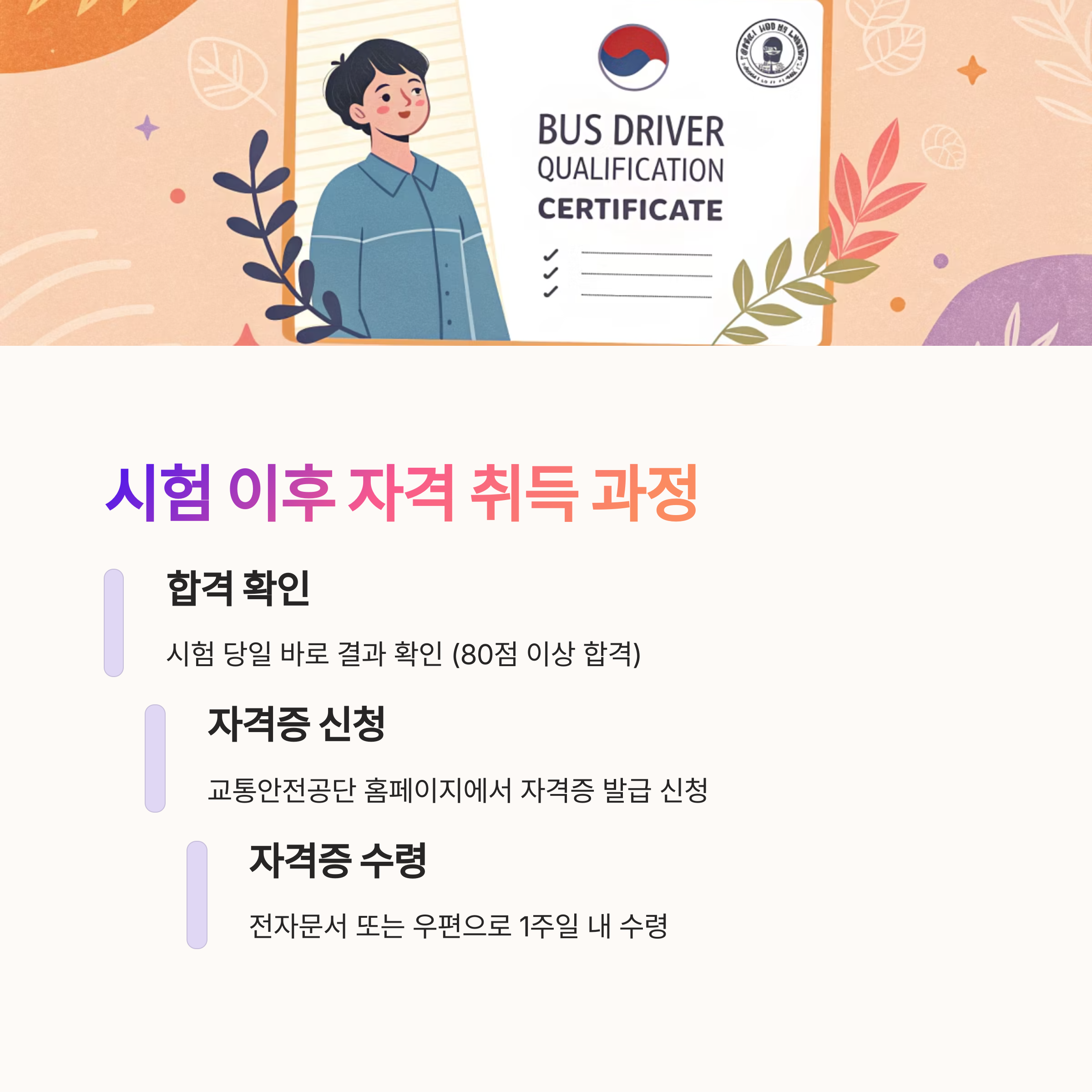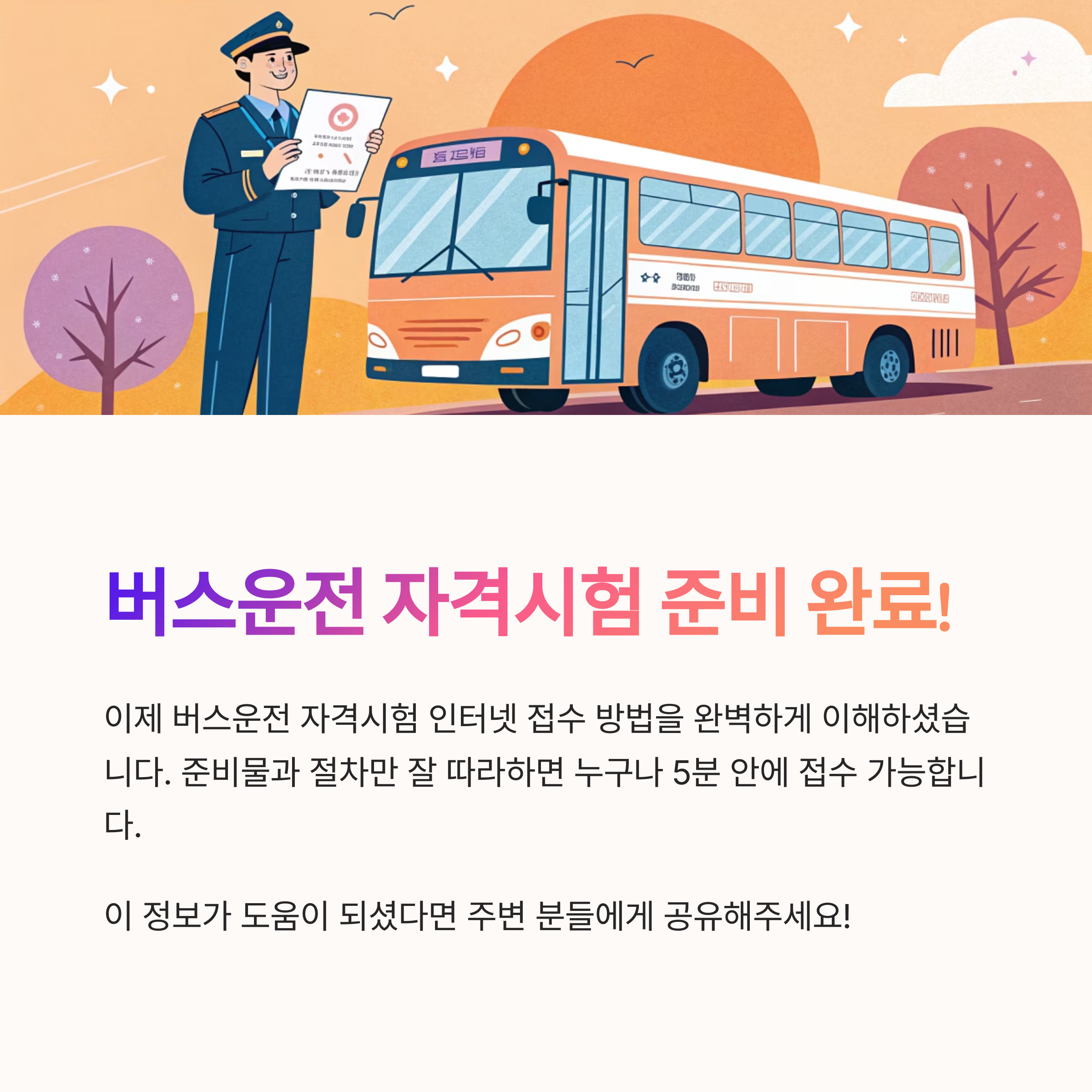 요약하자면, 버스운전 자격시험은 누구나 응시할 수 있는 기회가 열려 있고, 실기 없이 필기시험만으로 자격을 취득할 수 있는 매우 효율적인 제도예요. 자격만 갖추고 있다면 나이와 경력에 상관없이 도전할 수 있어 많은 사람들이 새로운 직업으로 선택하고 있답니다.