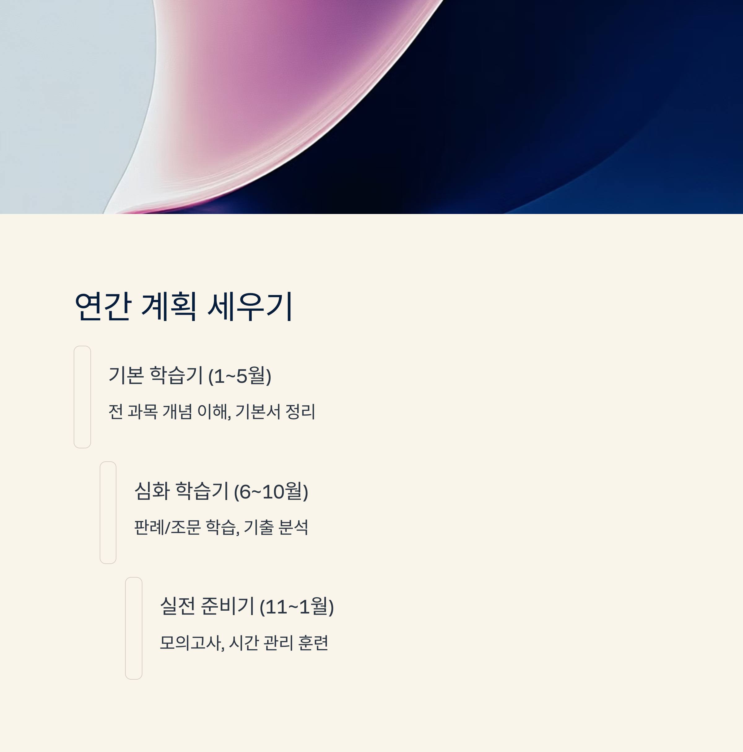 변호사시험 준비는 단거리 경주가 아니라 마라톤이에요. 최소 1년, 길게는 1년 반에서 2년 동안 장기적으로 공부해야 하죠. 연간 계획을 짤 땐 먼저 전체 일정을 3단계로 나누는 게 좋아요: 기본 학습기, 심화 학습기, 실전 모의고사기예요. 이 세 단계는 각각 4~6개월씩 잡는 게 일반적이에요.