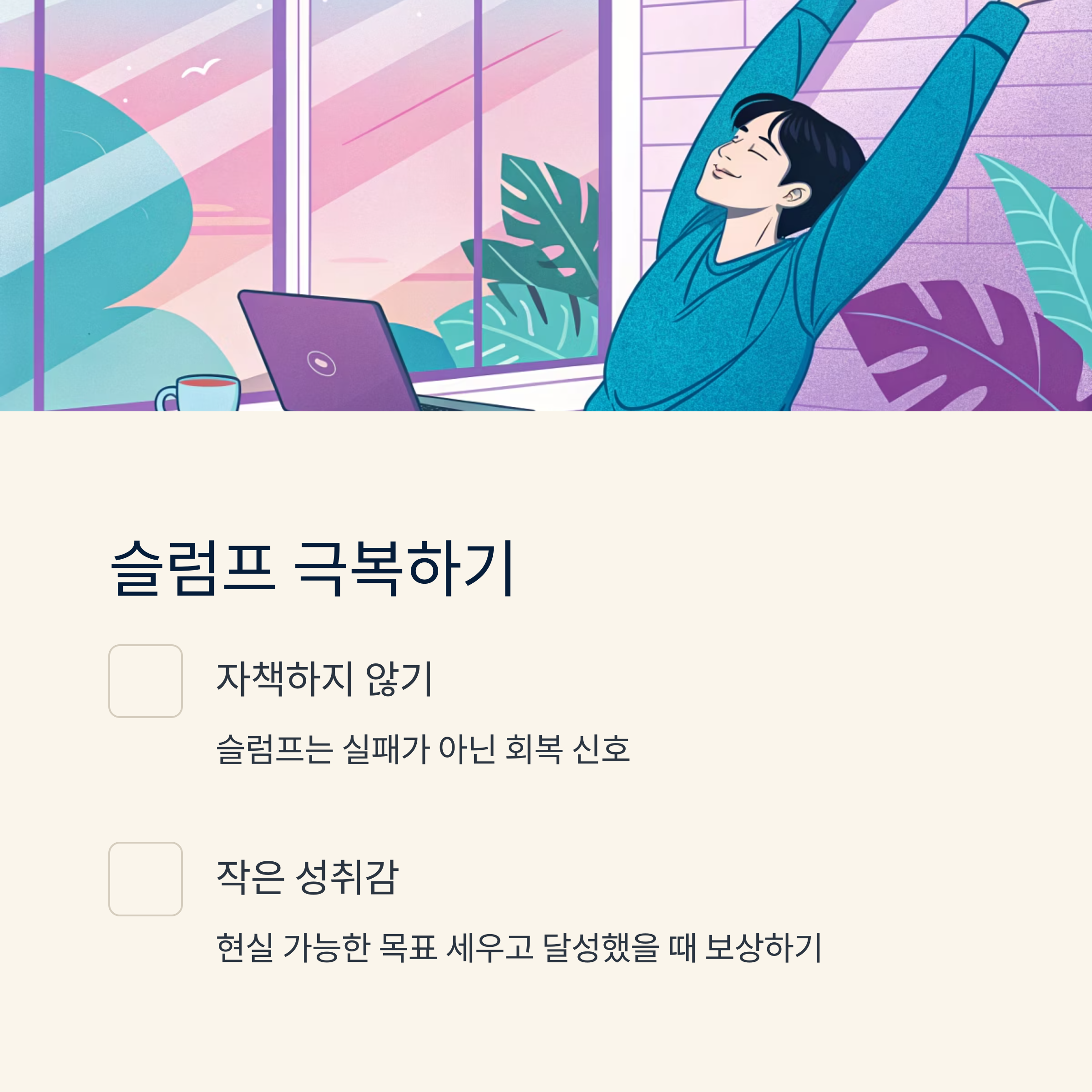 슬럼프가 왔을 땐 억지로 책상 앞에 붙어있기보다 짧은 휴식을 갖는 게 좋아요. 하루 정도는 공부를 내려놓고 걷거나 좋아하는 취미를 해보세요. 그런 시간이 쌓이면 오히려 공부 효율이 올라가고, 마인드가 리셋돼요. 중요한 건 완전히 공부를 끊지 않는 '가벼운 연결'을 유지하는 거예요.