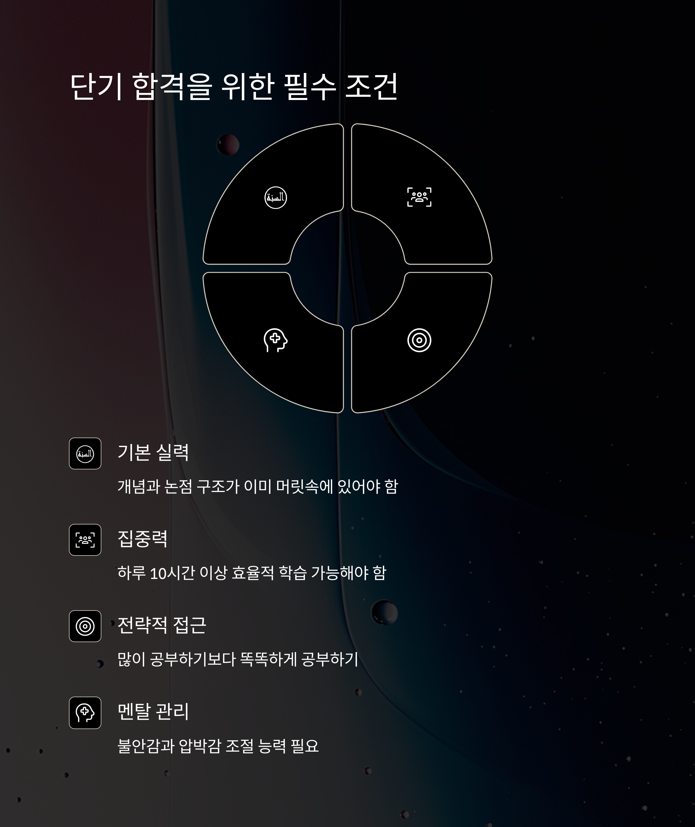그럼에도 불구하고 매년 단기간 준비로 합격한 사람들의 사례가 있어요. 이들은 시간 부족을 실력과 전략으로 극복한 케이스죠. 시험의 특성과 구조를 정확히 파악한다면 단기간 승부도 가능하긴 해요.
