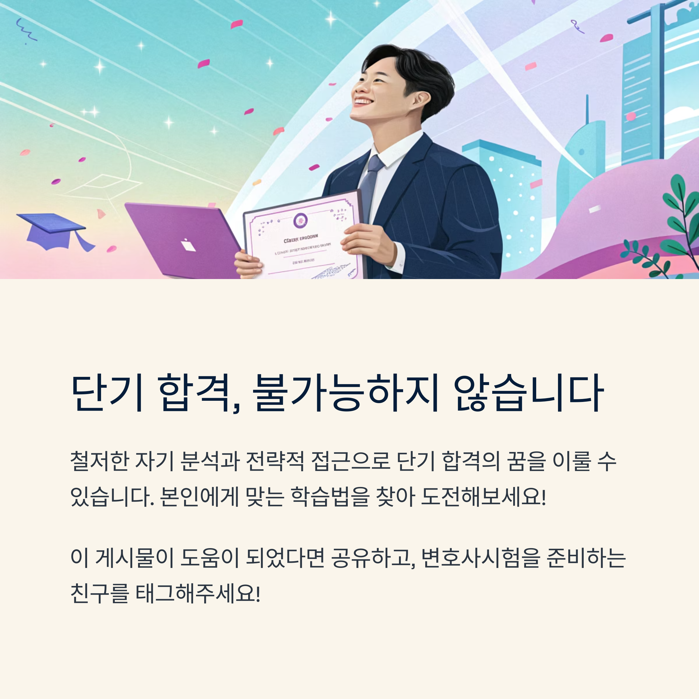 내가 생각했을 때 단기 합격은 단순히 '빠른 공부'가 아니라, '지금까지 쌓아온 것들을 얼마나 날카롭게 정리하느냐'에 달린 문제 같아요. 그래서 로스쿨 재학 중 공부를 성실히 해왔던 사람들에게 더 유리하다고 느껴져요.