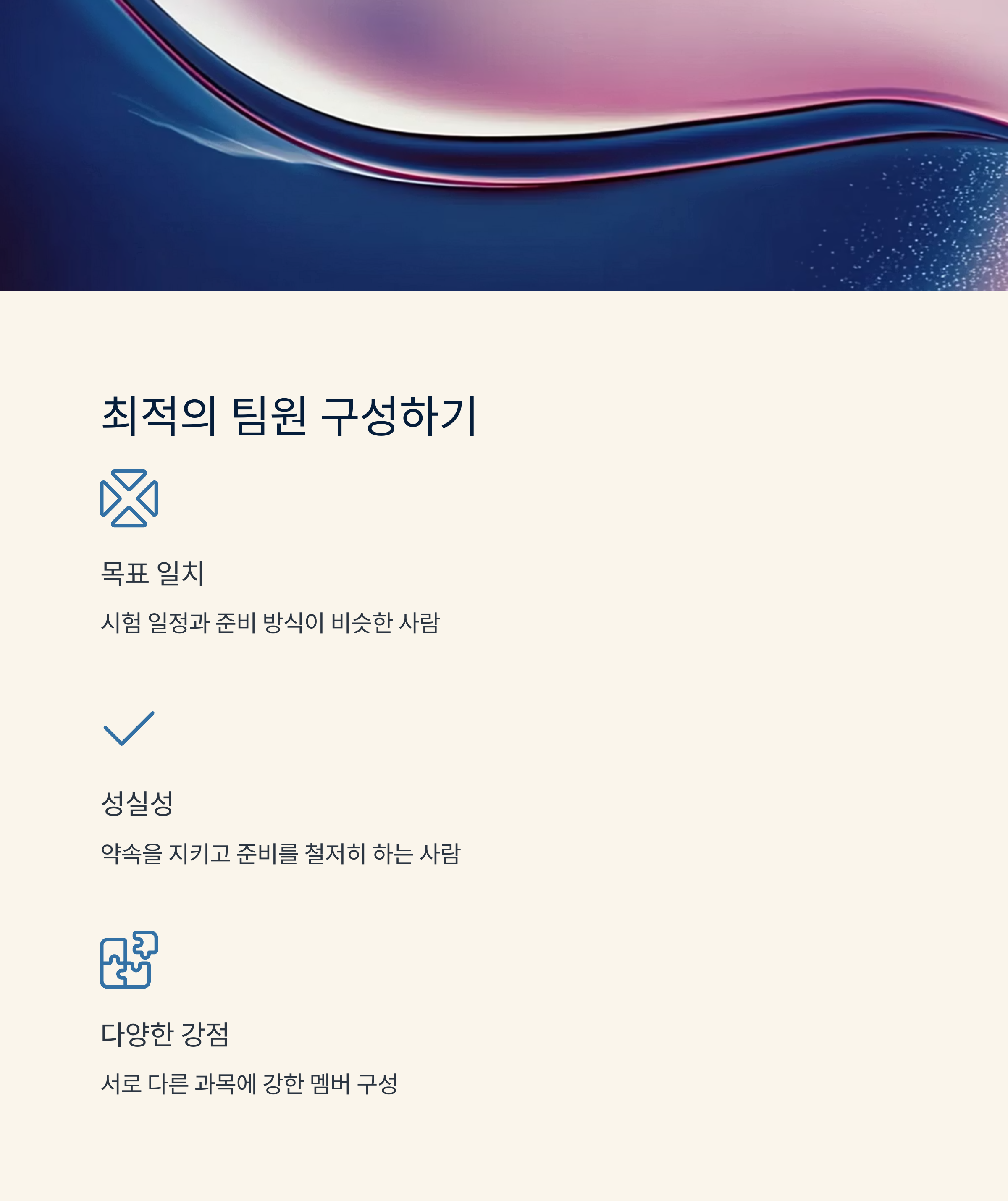 팀원 구성 시 가장 중요한 건 ‘목표와 열정이 비슷한 사람들’이에요. 시험에 임하는 자세가 비슷해야 서로 자극받고 긴장감을 유지할 수 있어요. 예를 들어 한 명은 1차 시험 준비 중인데, 다른 멤버는 2차만 준비하고 있다면 집중해야 할 방향이 엇갈릴 수 있답니다.