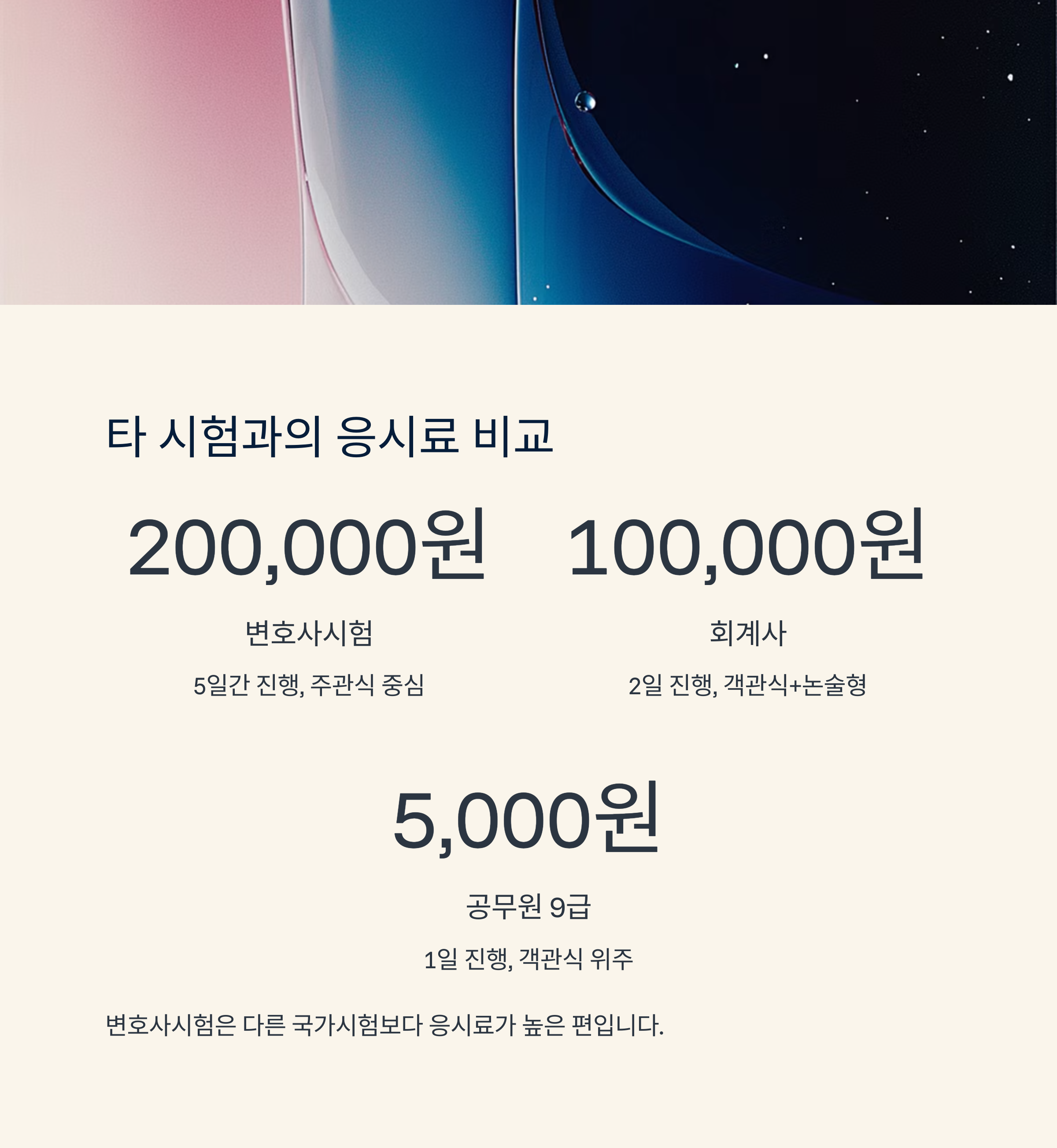 비교 대상이 되는 다른 시험들도 중요하긴 하지만, 변호사시험만큼 전국적으로 동시다발적으로 고사장을 운영하고, 긴 시간을 투자해야 하는 경우는 드물어요. 그래서 응시료가 높을 수밖에 없는 구조라고 할 수 있어요.