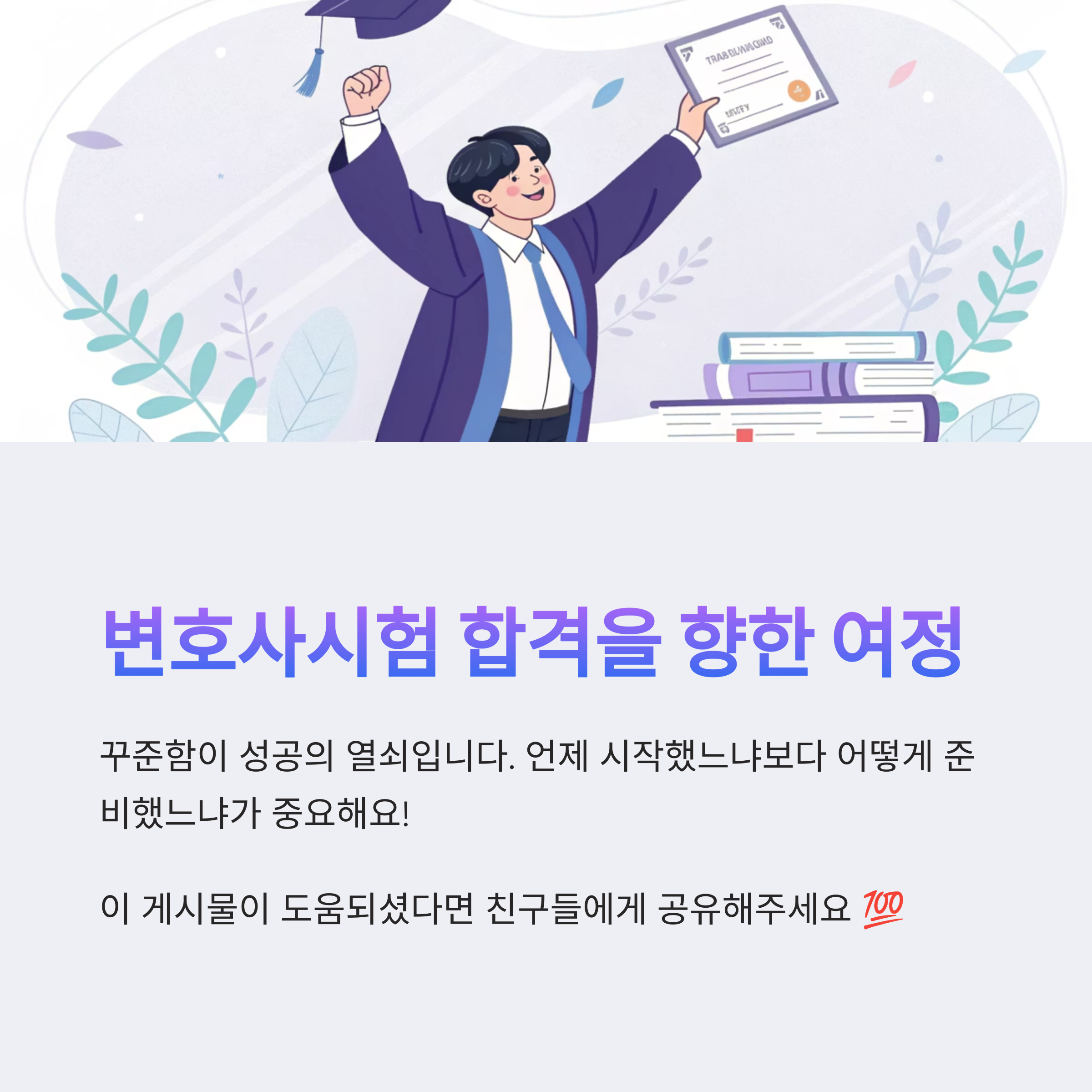 이런 전략을 바탕으로 각 과목을 고르게 준비하고, 학기별 로드맵에 따라 단계적으로 실력을 쌓는다면 변호사시험이 훨씬 가깝게 느껴질 거예요. 😊