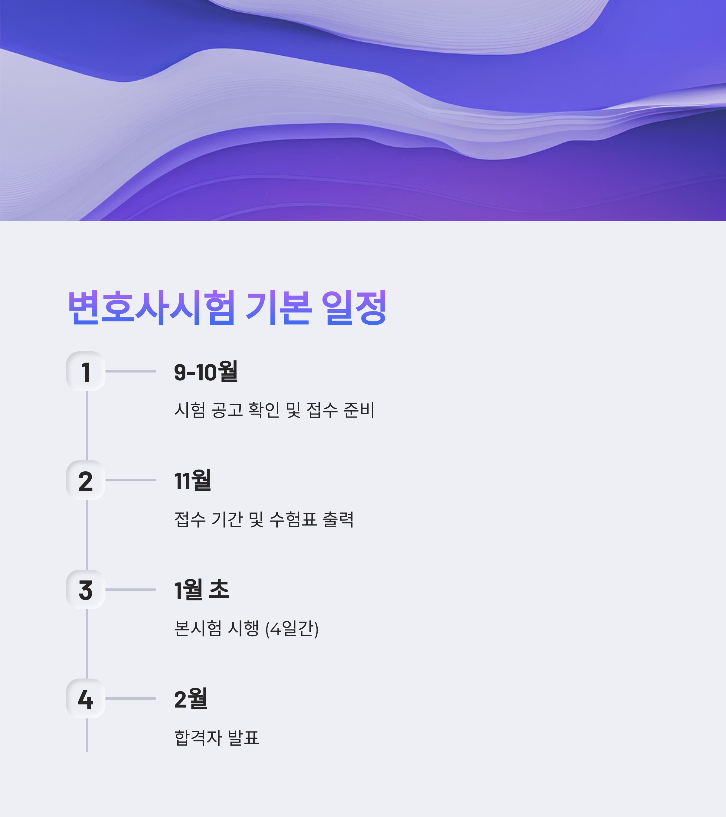 시험일정은 법무부에서 주관하며, 정확한 일정은 전년도 가을 무렵 발표돼요. 예를 들어 2025년 시험의 경우 2024년 10월에 공고가 나고, 시험은 2025년 1월 7일부터 10일까지 진행될 수 있어요. 시험 이후 약 한 달 정도 뒤에 결과가 발표돼요. 이 점을 감안해 전체 학습 스케줄을 설계해야 해요.