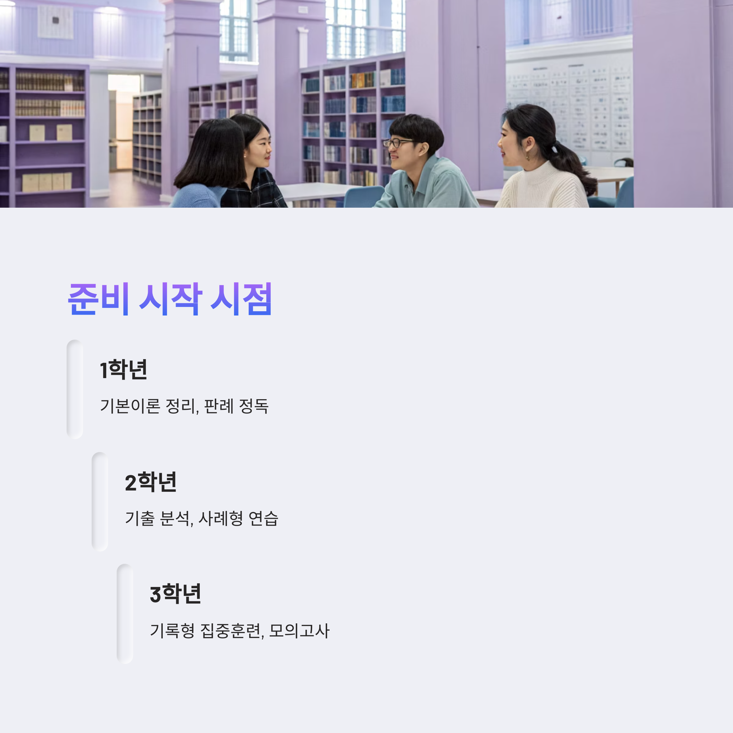 변호사시험 준비 시점은 개인의 상황에 따라 달라지지만, 일반적으로 로스쿨 입학 후 1학년 2학기부터 본격적인 학습이 시작돼요. 하지만 최근에는 로스쿨 입학 전부터 ‘예비시험 수준’으로 기초 법학을 미리 공부하는 경우도 많아졌어요. 경쟁이 치열해지면서 준비 시기가 점점 앞당겨지고 있는 추세죠.