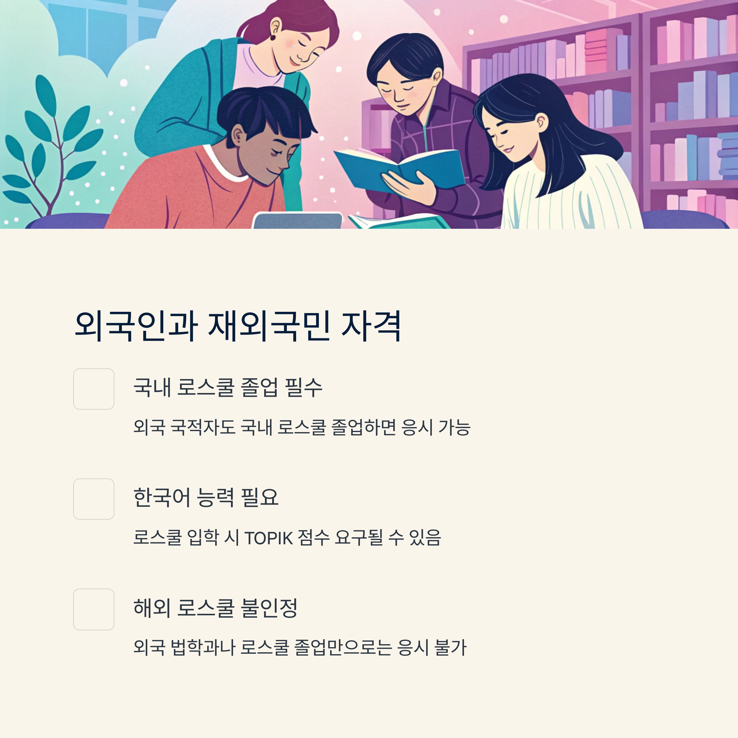 우선 외국인이라도 국내 로스쿨에 입학해서 정상적으로 졸업하면 응시 자격은 동일하게 인정돼요. 다만 로스쿨 자체가 외국인을 많이 받는 구조는 아니기 때문에 입학 자체가 쉽지 않아요. 입학 요건 중 하나로 TOPIK(한국어능력시험) 점수도 반영되는 경우가 있거든요.