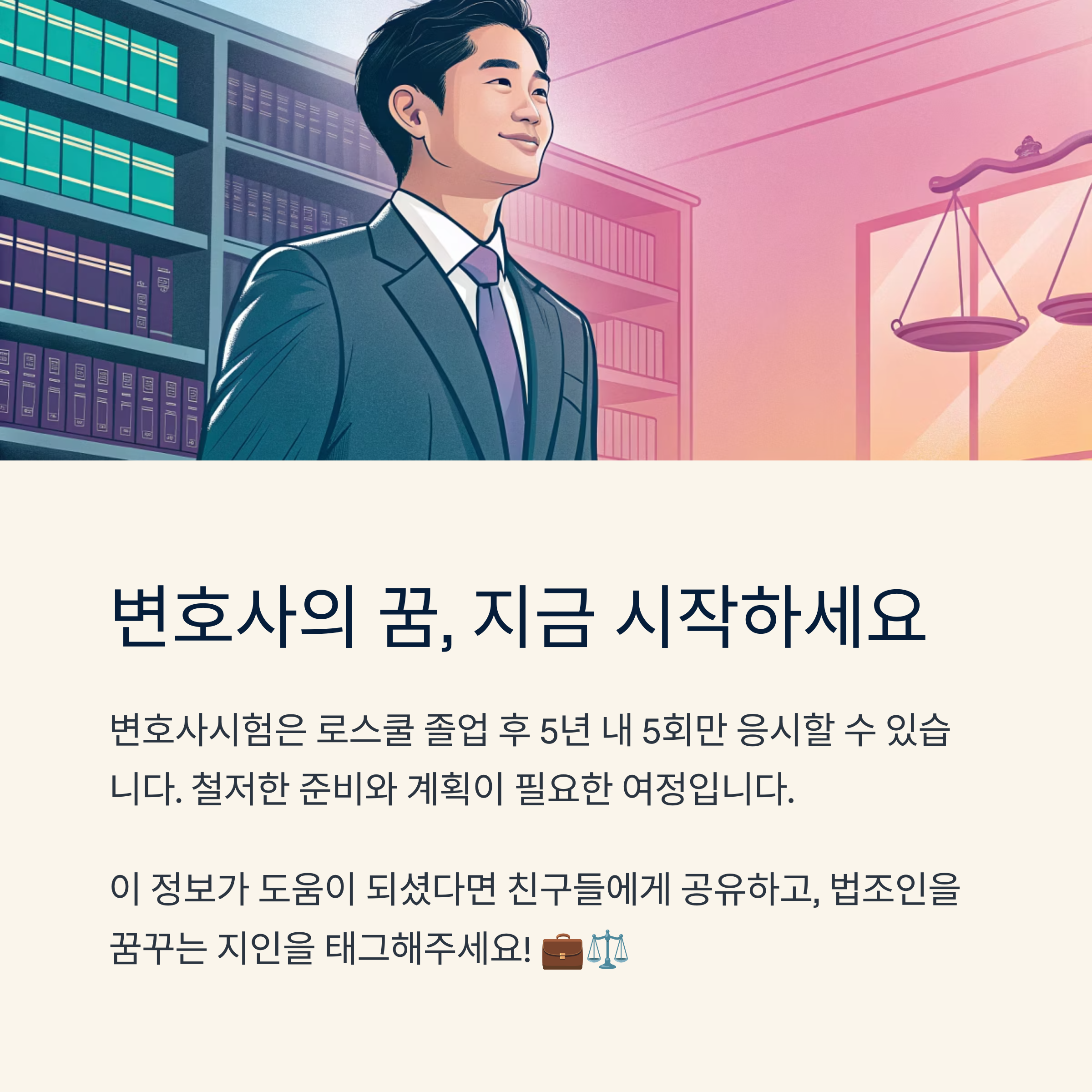 이 규정을 모르고 응시 기회를 흘려보내면 나중에 정말 후회하게 될 수 있어요. 로스쿨 입학과 동시에 '5년 5회'라는 타이머가 작동한다고 생각하는 게 좋아요. 📅