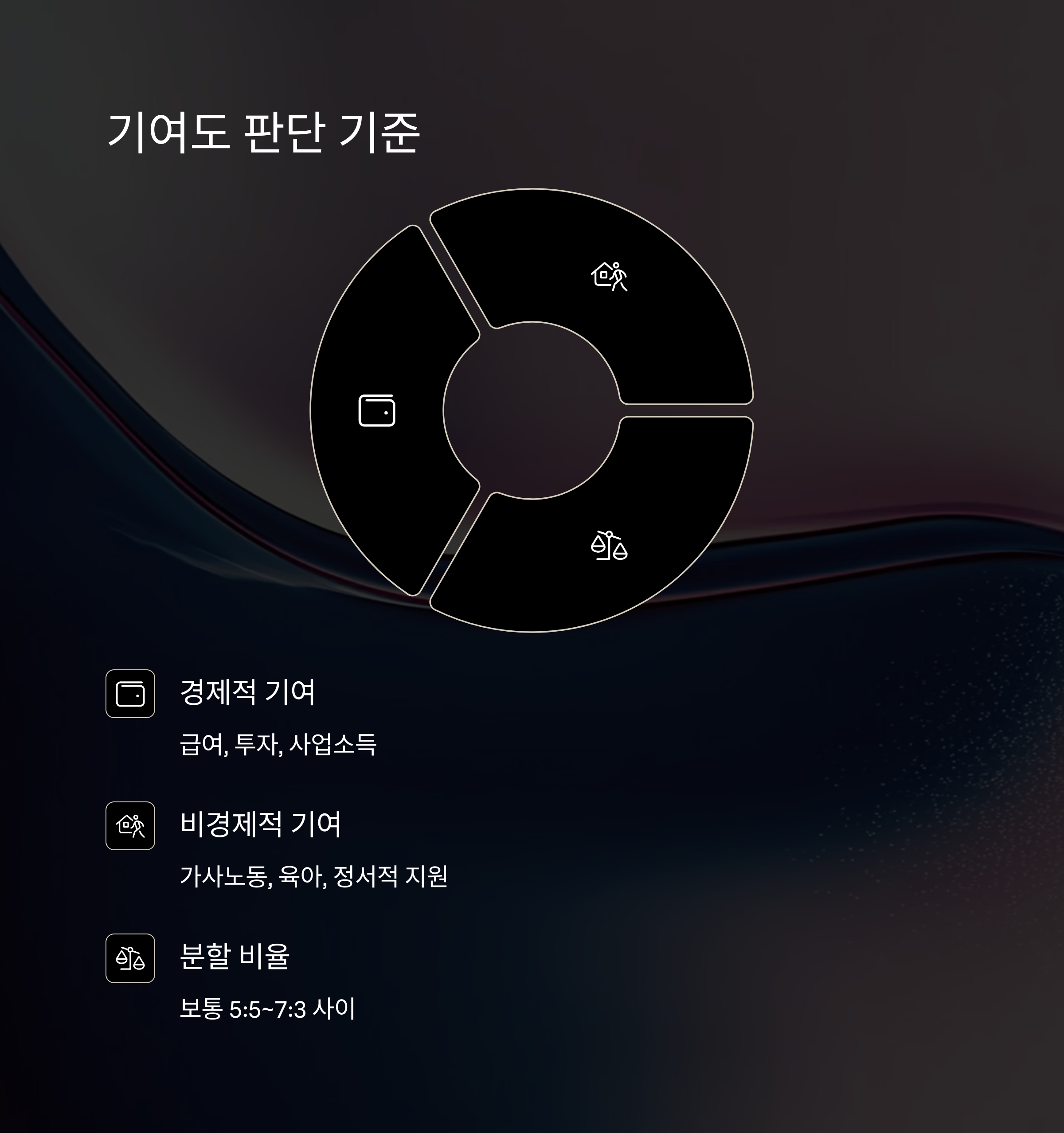 기여도는 보통 5:5에서 7:3 사이로 판단돼요. 다만 특별한 사정이 있거나, 상대방의 일방적 기여가 명백한 경우 8:2나 9:1까지 벌어지는 경우도 있답니다. 상황마다 달라서 구체적인 자료 제출이 아주 중요해요.