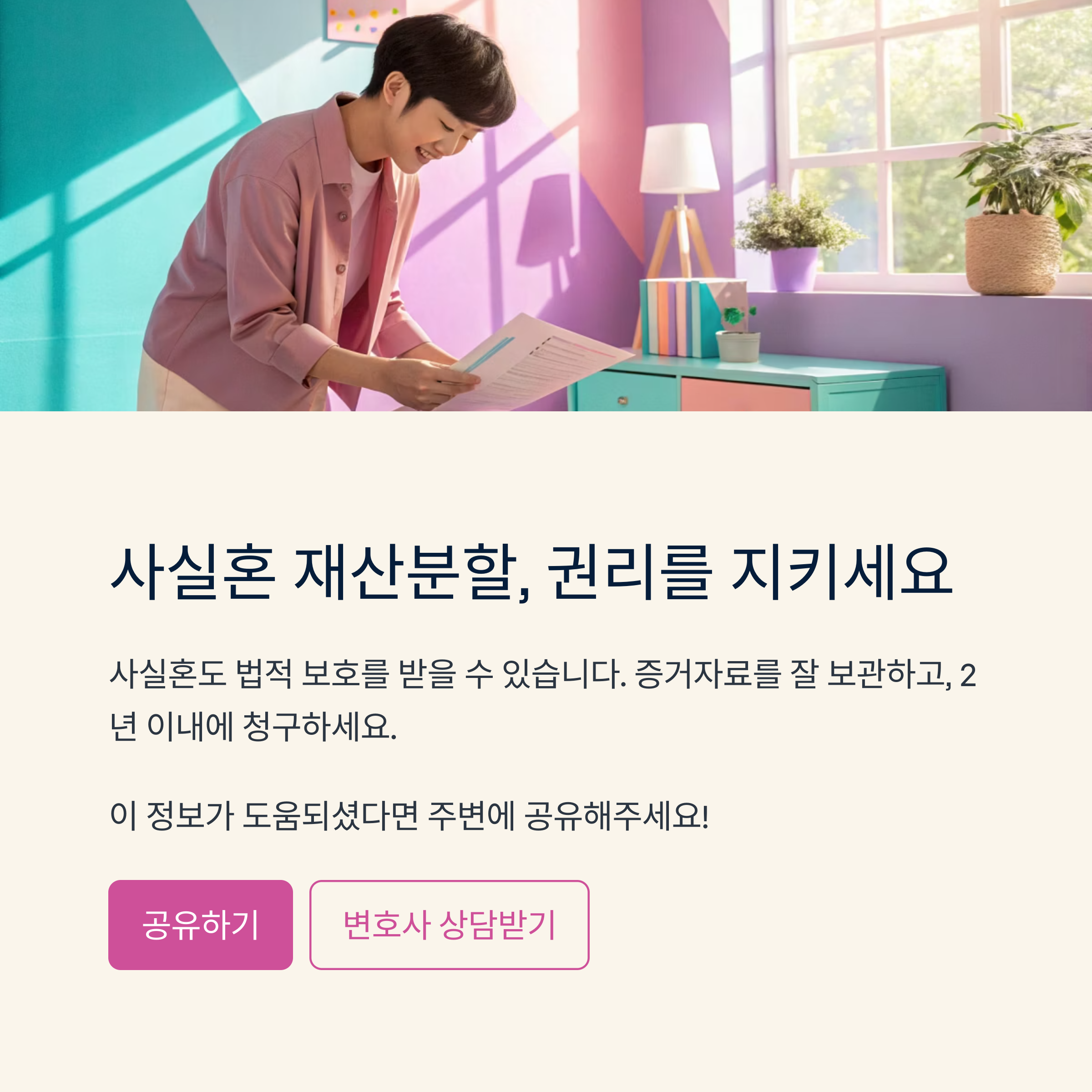 특히 재산 문제는 오랜 시간 누적된 만큼 민감할 수 있기 때문에, 사실혼일수록 더욱 꼼꼼한 준비와 기록이 필요하답니다.