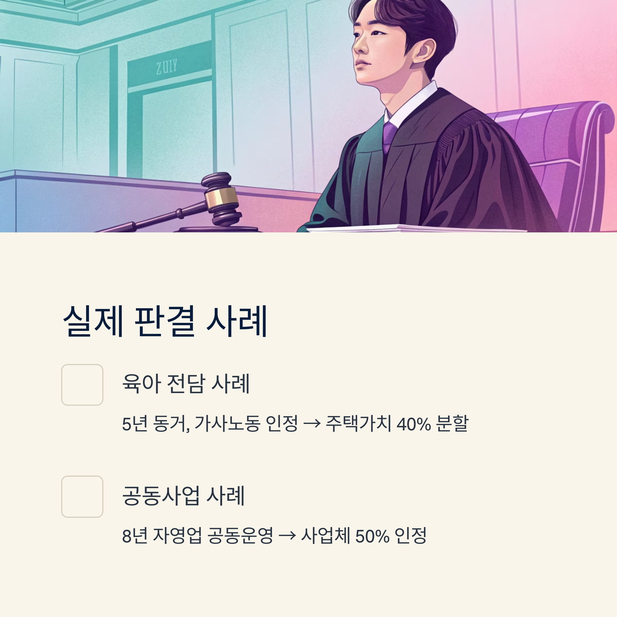 또 다른 사례에서는 C씨가 사실혼 배우자 D씨와 함께 자영업을 8년간 운영하며 매출 증가에 기여했지만, 사업자 등록은 D씨 명의였어요. D씨는 본인 명의임을 이유로 사업체 전체를 주장했지만, 법원은 C씨의 기여도를 50%로 보고 수익과 재산을 반반 나누라고 했답니다.