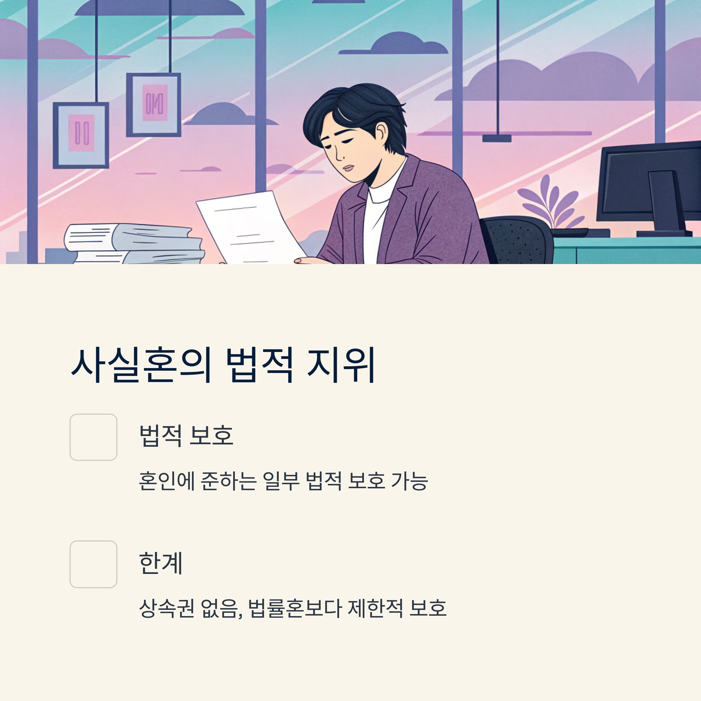 사실혼이라는 상태는 자칫하면 권리를 주장하지 못하고 끝나버릴 수 있으니, 미리 법적 조건을 확인해보는 게 중요해요.