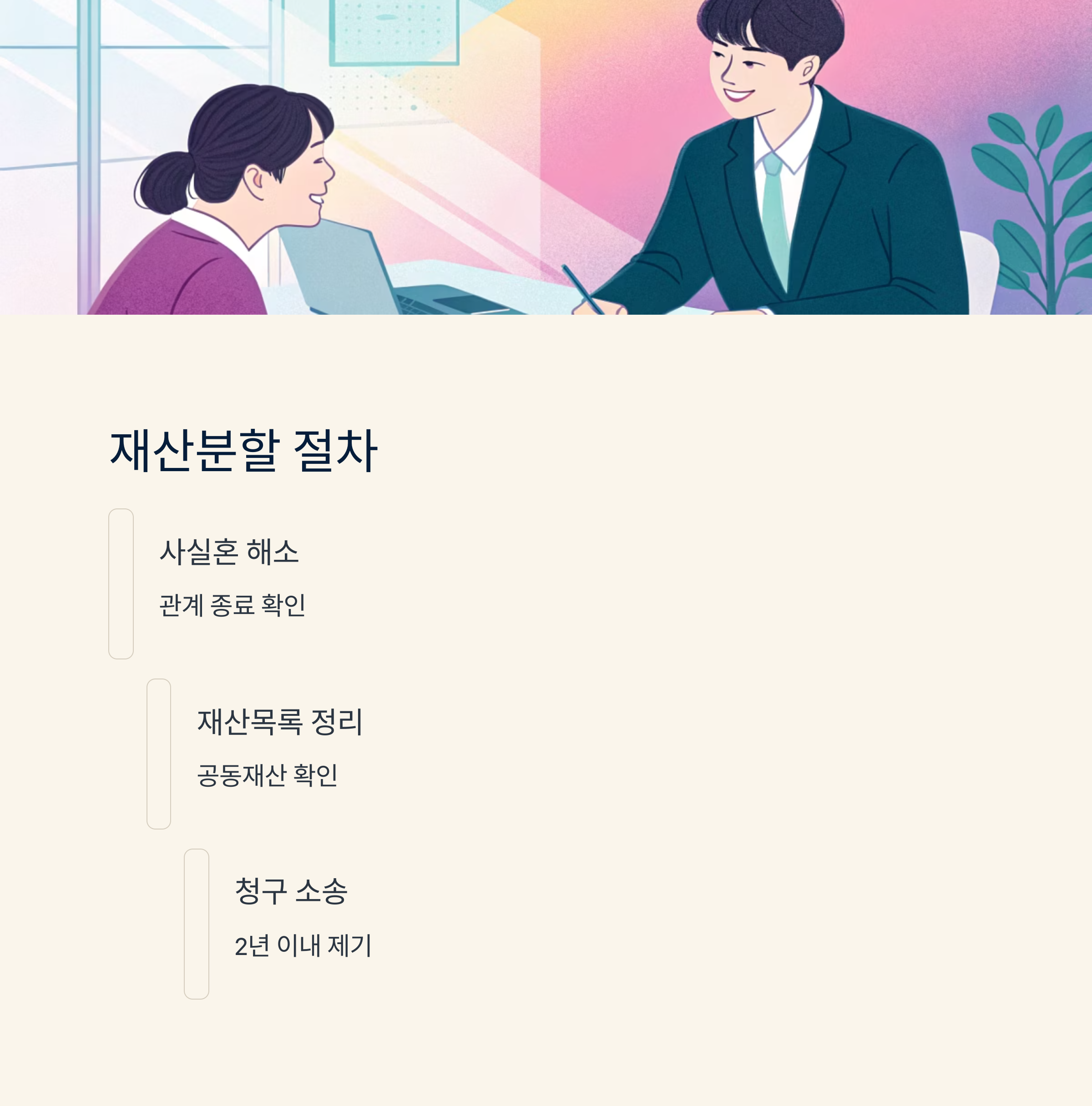 재산분할청구는 원칙적으로 사실혼이 해소된 날로부터 2년 이내에 해야 해요. 이 기간을 놓치면 법적 권리를 행사할 수 없게 되니, 시간도 굉장히 중요해요. 혼인과 달리 사실혼은 해소일을 따로 명확하게 정하기 어려울 수 있어서, 문자, 이메일 등 사실혼 종료를 입증할 수 있는 자료도 중요하답니다.