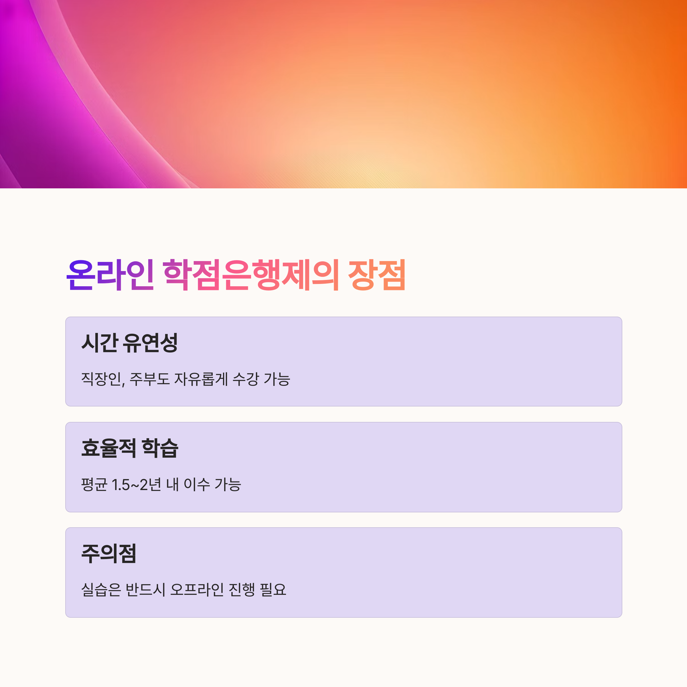 | 학점은행제 (비전공) | 18개월~2년 | 주말/온라인 병행 가능 |