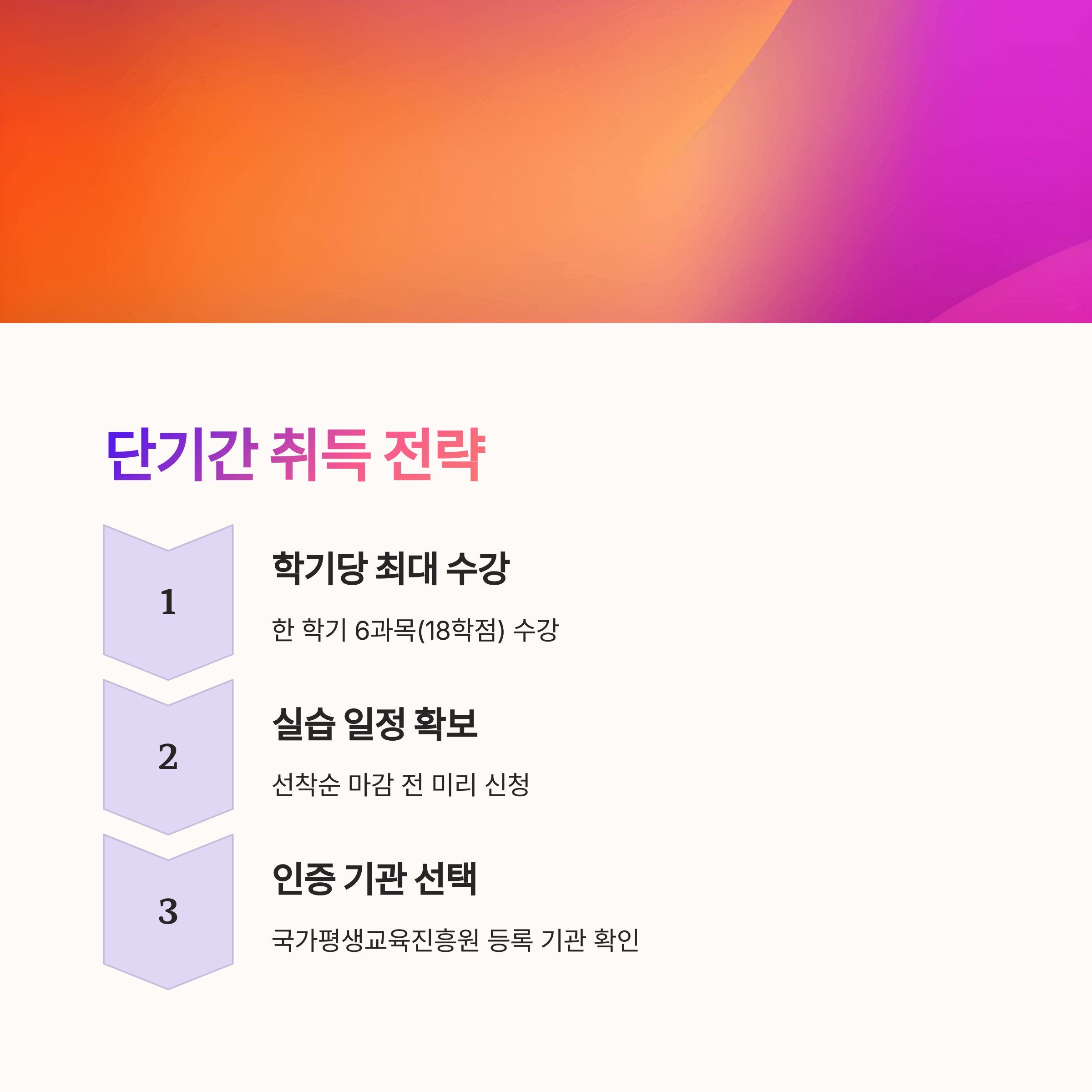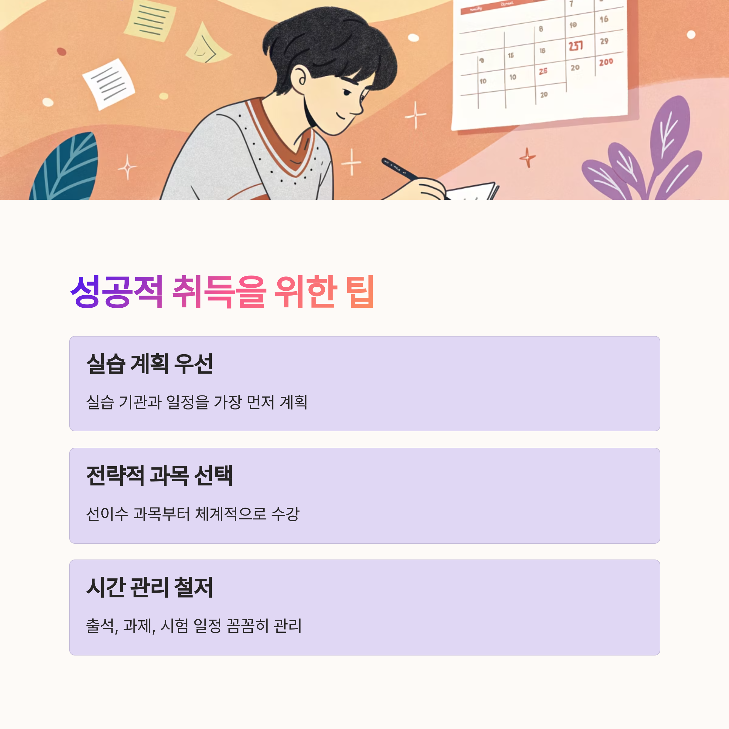 단기 취득의 핵심은 시간표 구성이에요. 이론 수업을 최대한 빠르게 채우면서 실습 신청 타이밍을 맞추는 게 중요하죠. 이때 과목 선택, 시험 일정, 과제 제출 등이 겹치기 때문에 체력적으로도 부담이 클 수 있어요.