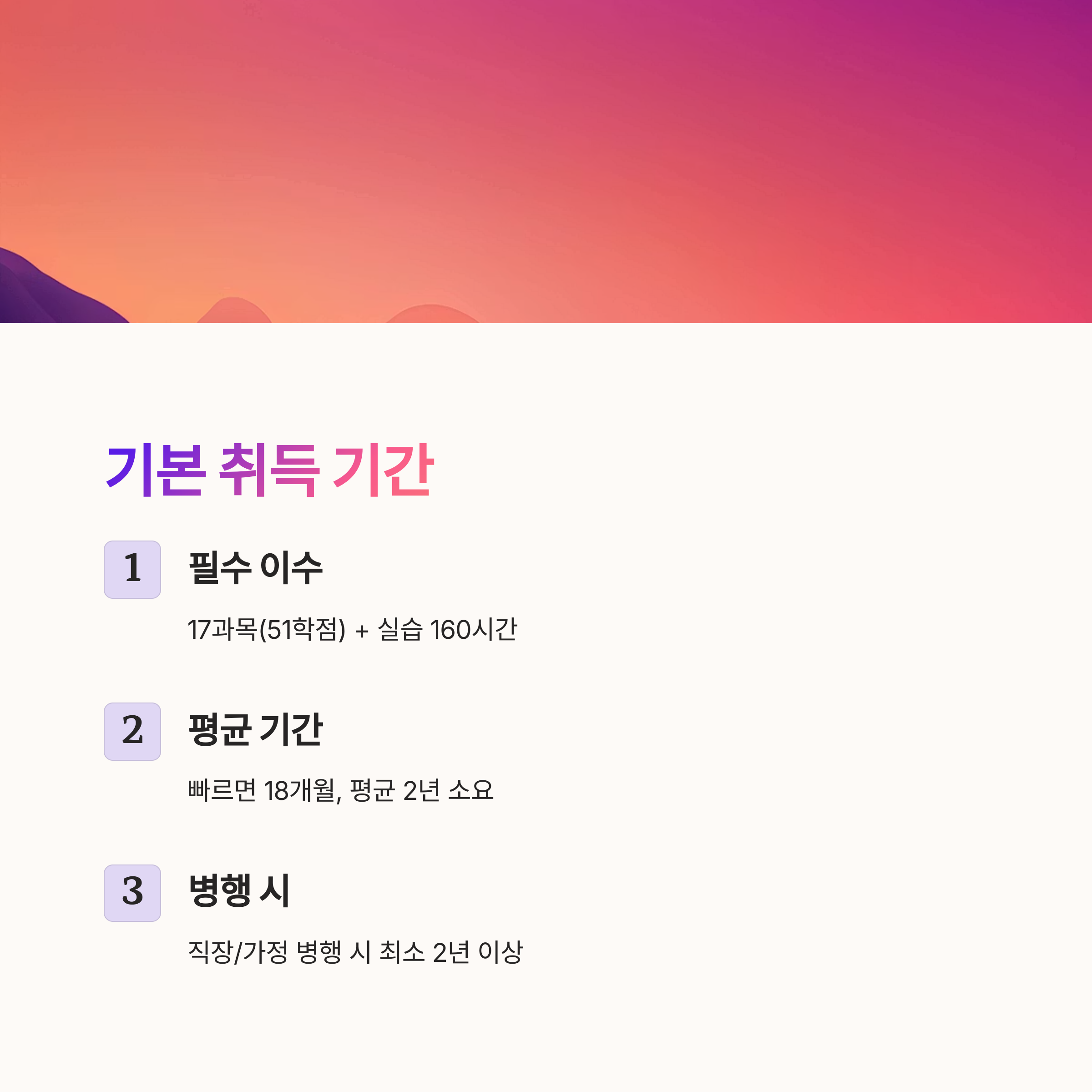 그래서 일반적으로 "빠르면 18개월, 평균 2년"이라고 말할 수 있어요. 단, 직장이나 가정과 병행한다면 최소 2년 이상 잡는 게 현실적으로 여유가 있어 보여요. 😅