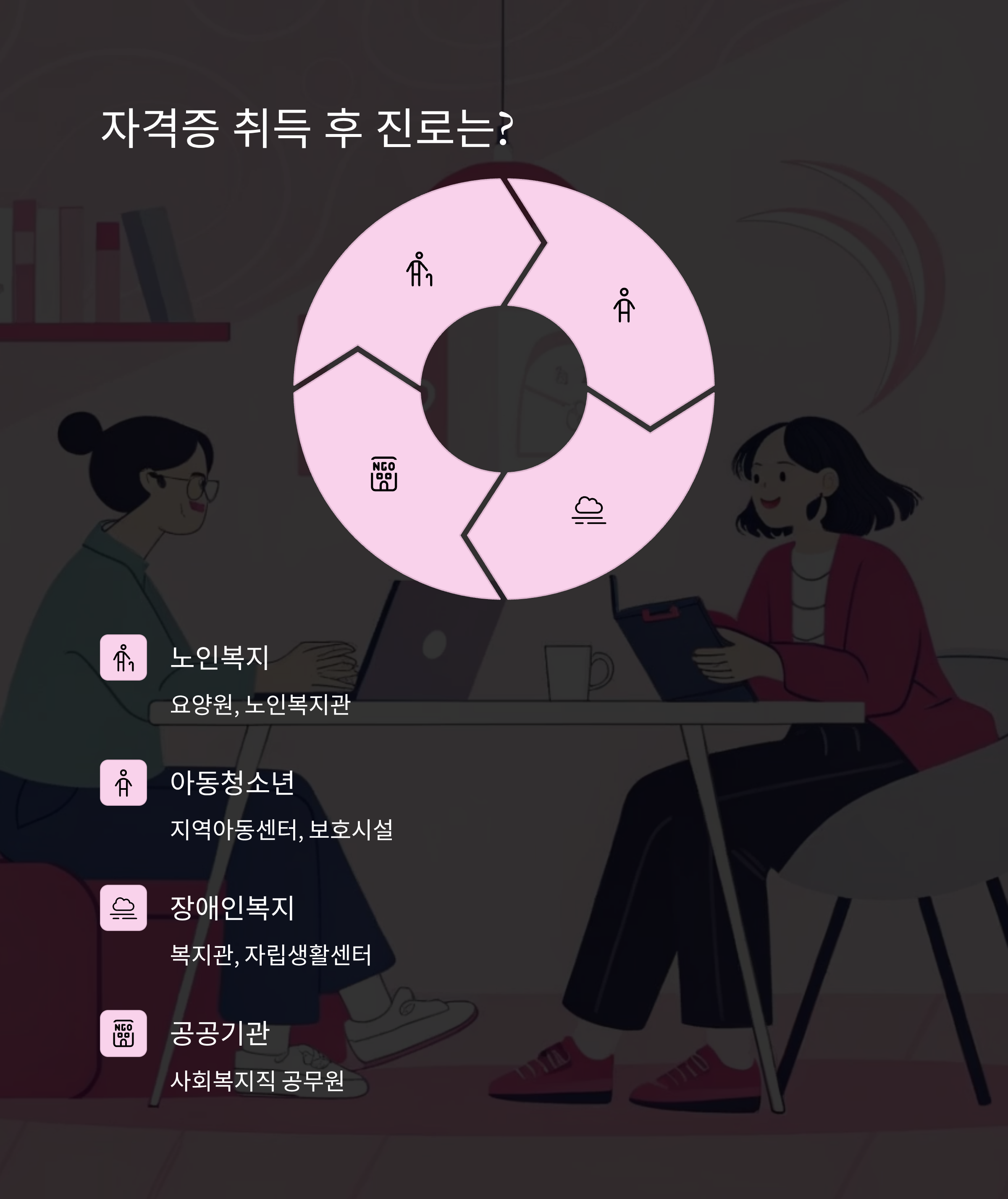 사회복지사 2급 자격증을 취득하면 다양한 복지 분야로 진출할 수 있어요. 노인복지관, 아동센터, 장애인복지시설, 정신보건센터 등에서 근무할 수 있으며, 지방자치단체 산하 사회복지직 공무원 시험 응시 자격도 생기죠.
