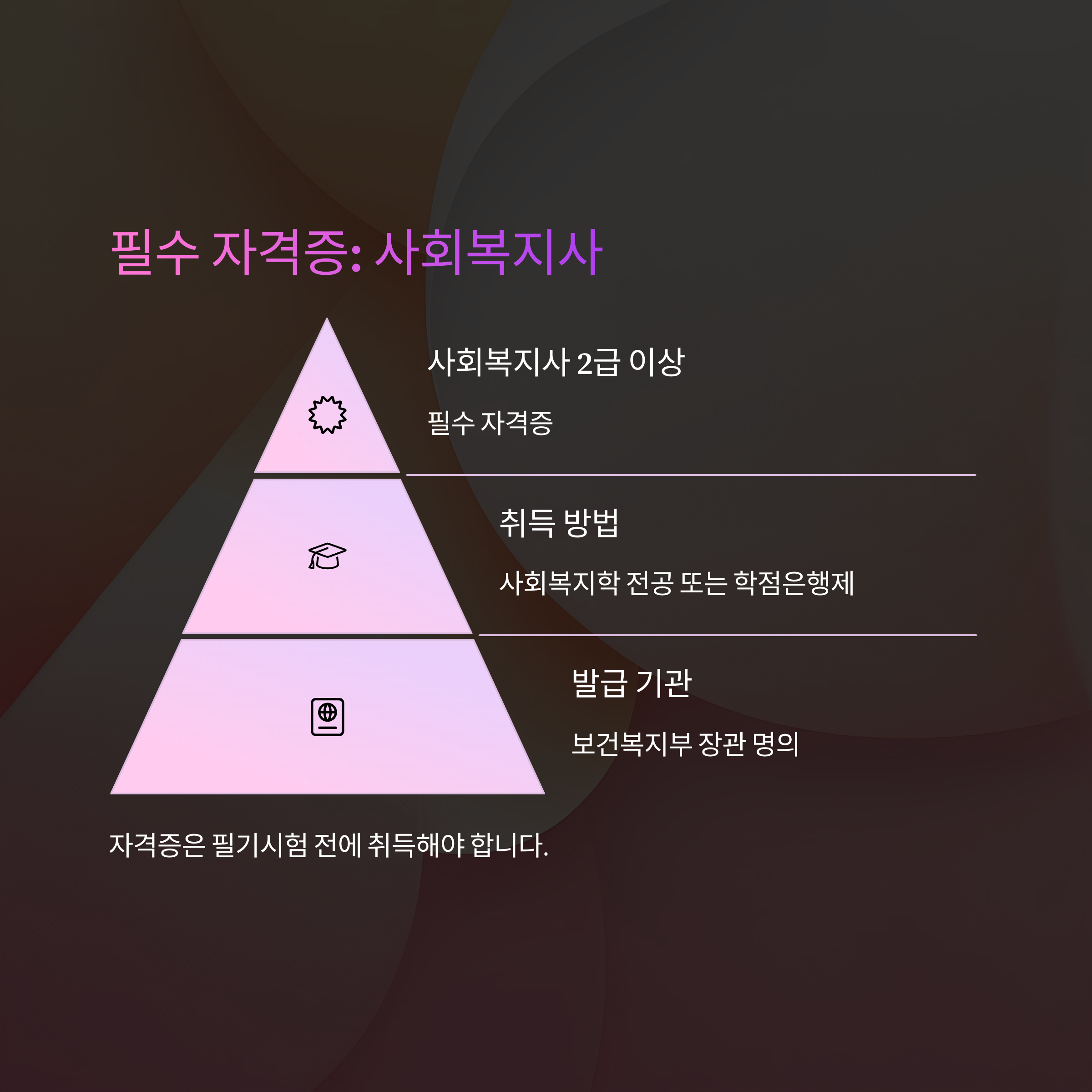 사회복지직 9급 공무원에 응시하기 위해서는 반드시 '사회복지사 2급' 이상의 자격증을 보유하고 있어야 해요. 이 자격증이 없으면 응시 자체가 불가능하니 반드시 사전에 취득해야 해요.