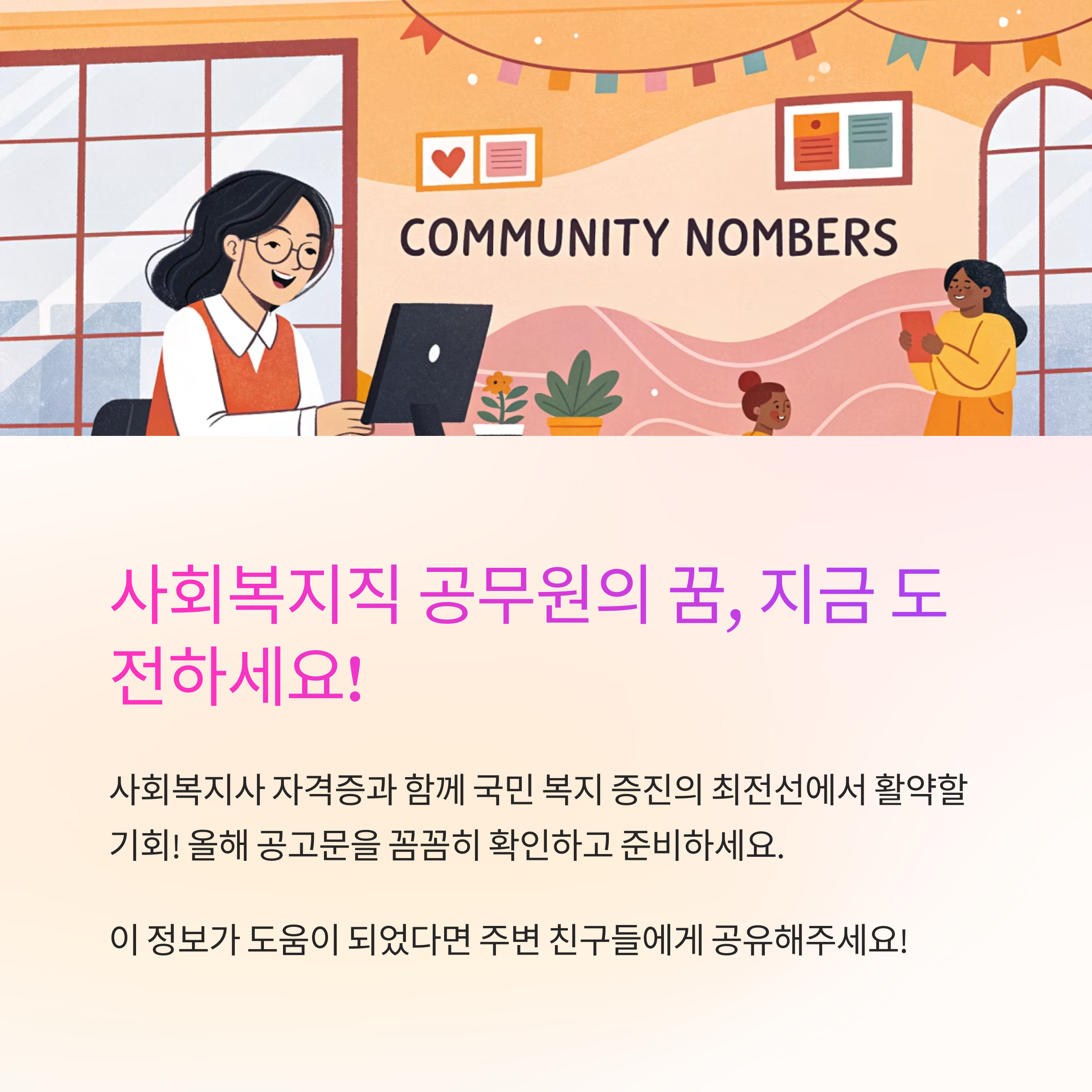 또한 영어 성적을 요구하지 않는다는 점도 다른 공무원 시험과의 차별점이에요. 외국어보다 실무 중심의 복지 지식과 인성, 행정 이해도가 더 중요하게 여겨진다는 뜻이에요.