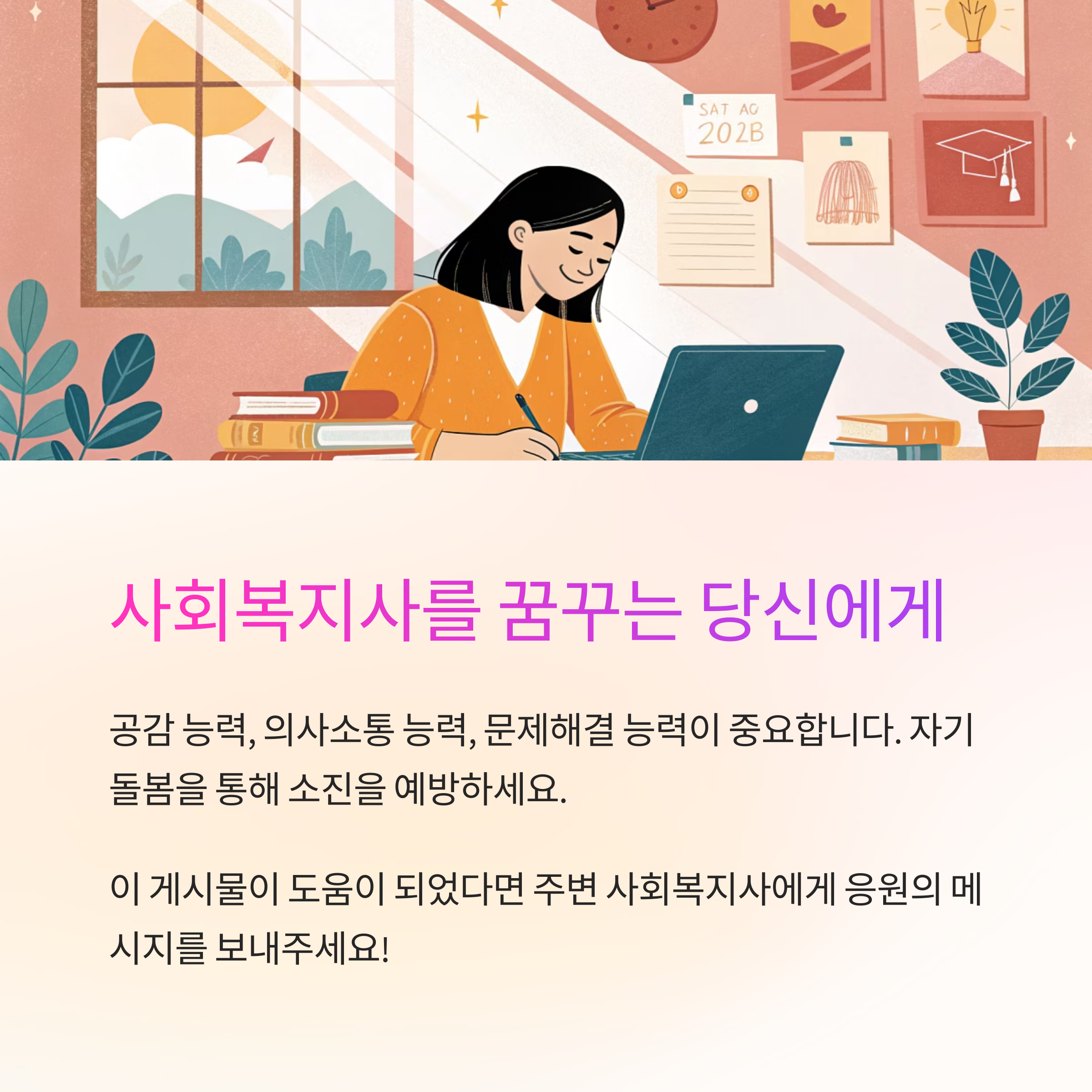 각 분야의 근무 조건은 다르지만, 공통적으로 요구되는 자질은 ‘사람을 향한 관심과 공감능력’이에요. 어느 분야에서 일하든 사회복지사는 타인의 삶에 깊이 관여하는 일을 하게 되니까요. 특히 위기 상황에서는 빠르게 판단하고 개입하는 역량도 중요하답니다.