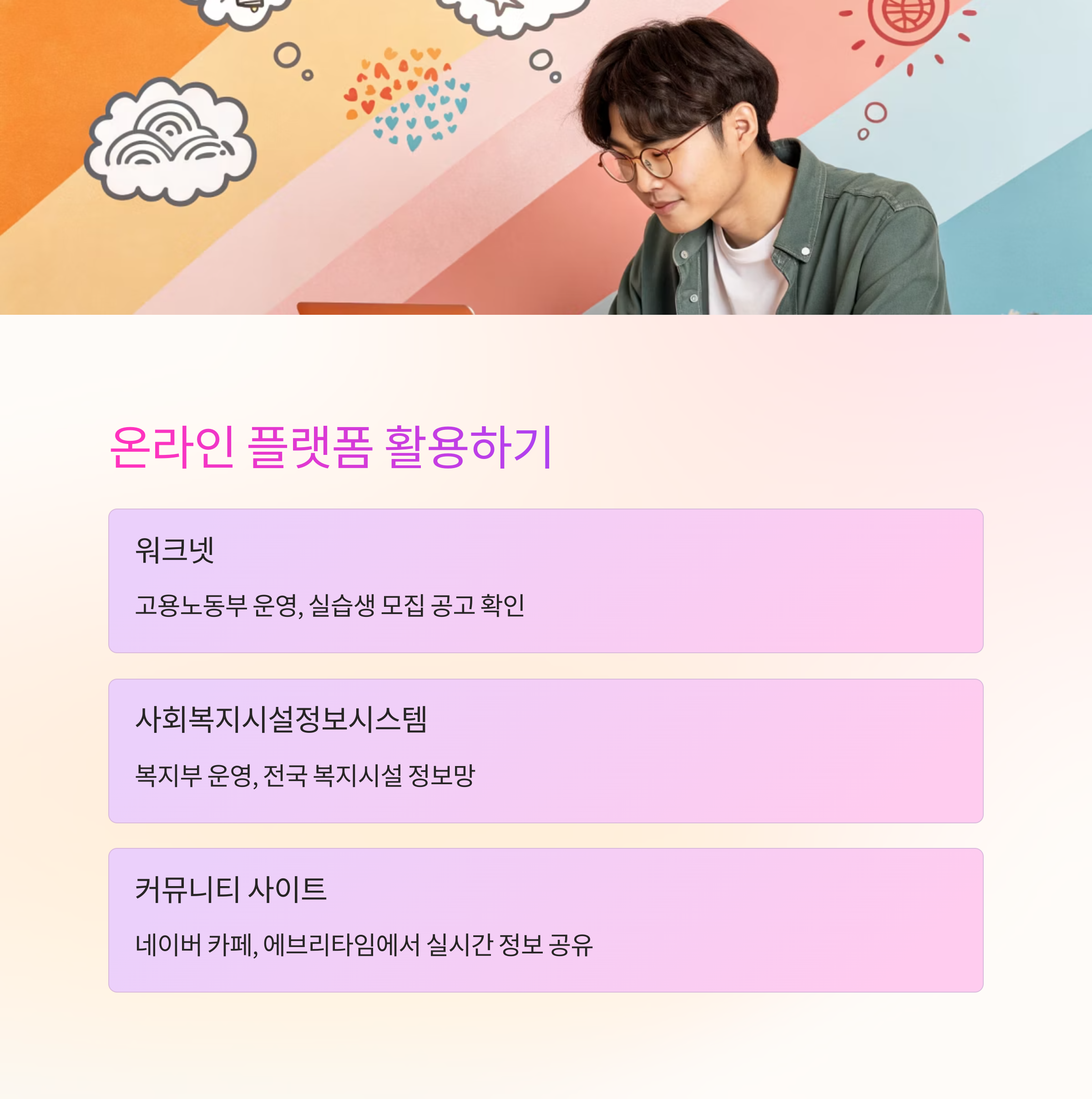 이렇게 다양한 경로를 활용해서 실습 기관 정보를 수집해보세요. 여러 루트를 통해 정보를 비교해보면 정말 나한테 맞는 기관을 고를 수 있게 될 거예요. 🤗