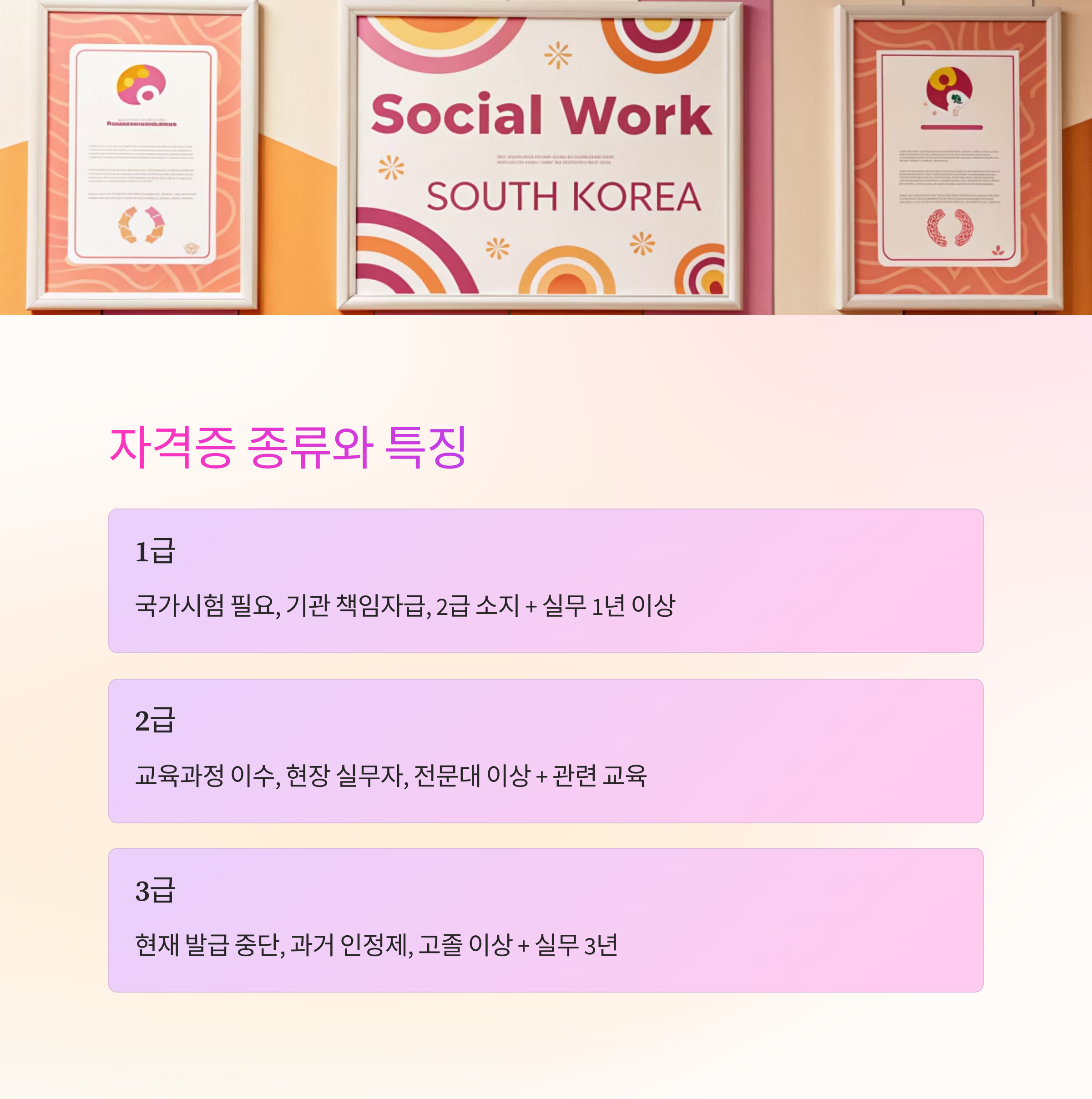 사회복지사 자격증은 사람을 돕는 따뜻한 마음과 함께 전문적인 지식을 갖추기 위해 꼭 필요한 자격이에요. 다양한 등급과 경로로 나뉘어 있어서 내가 원하는 방향에 따라 맞춤형으로 준비할 수 있는 매력이 있답니다.
