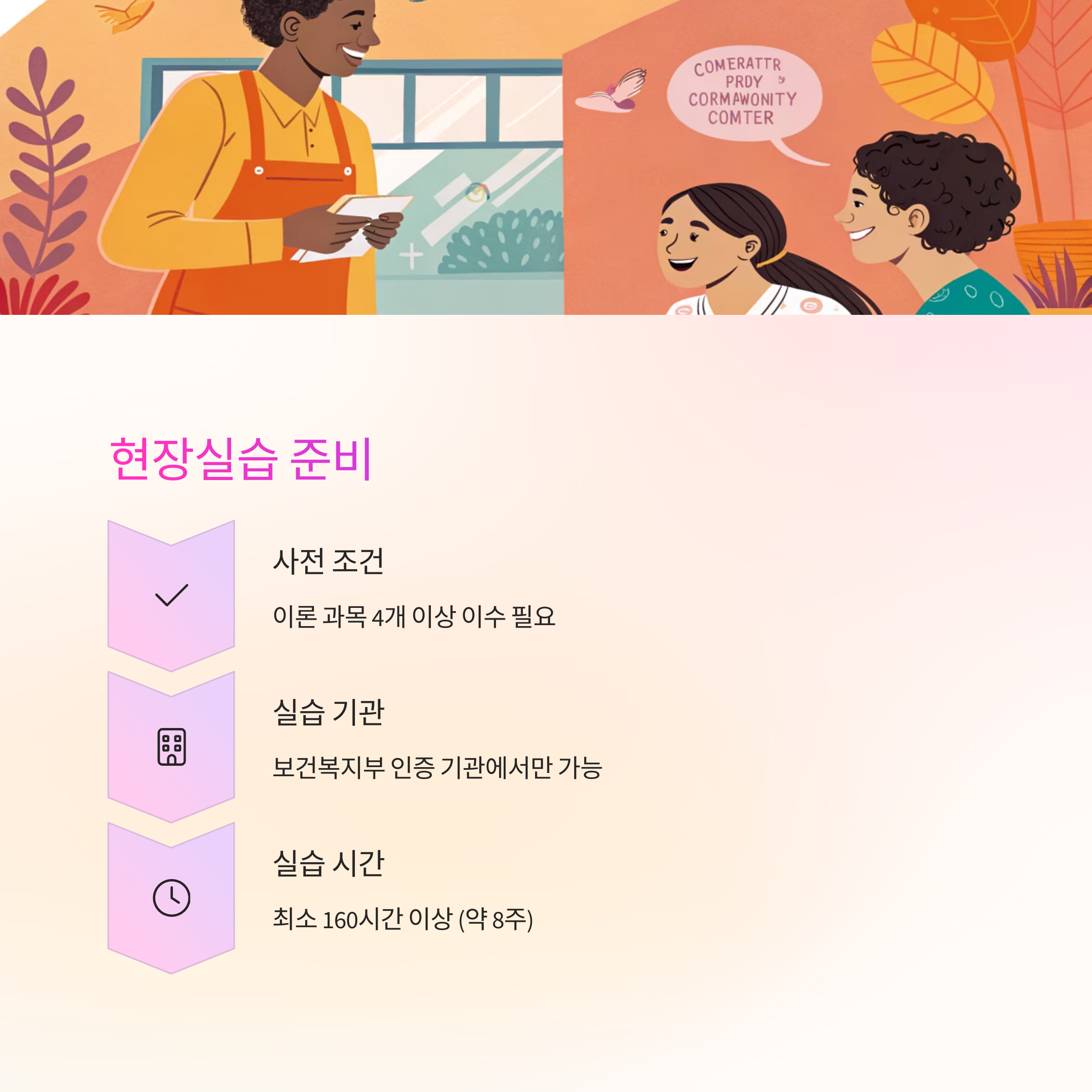 실습 기간은 ‘최소 160시간’ 이상이며, 일반적으로 주 2~3회, 하루 6~8시간 기준으로 약 8주간 진행돼요. 실습 중에는 기관일지, 실습일지, 실습보고서 등 문서 작성이 병행되므로 정리 습관도 중요해요.