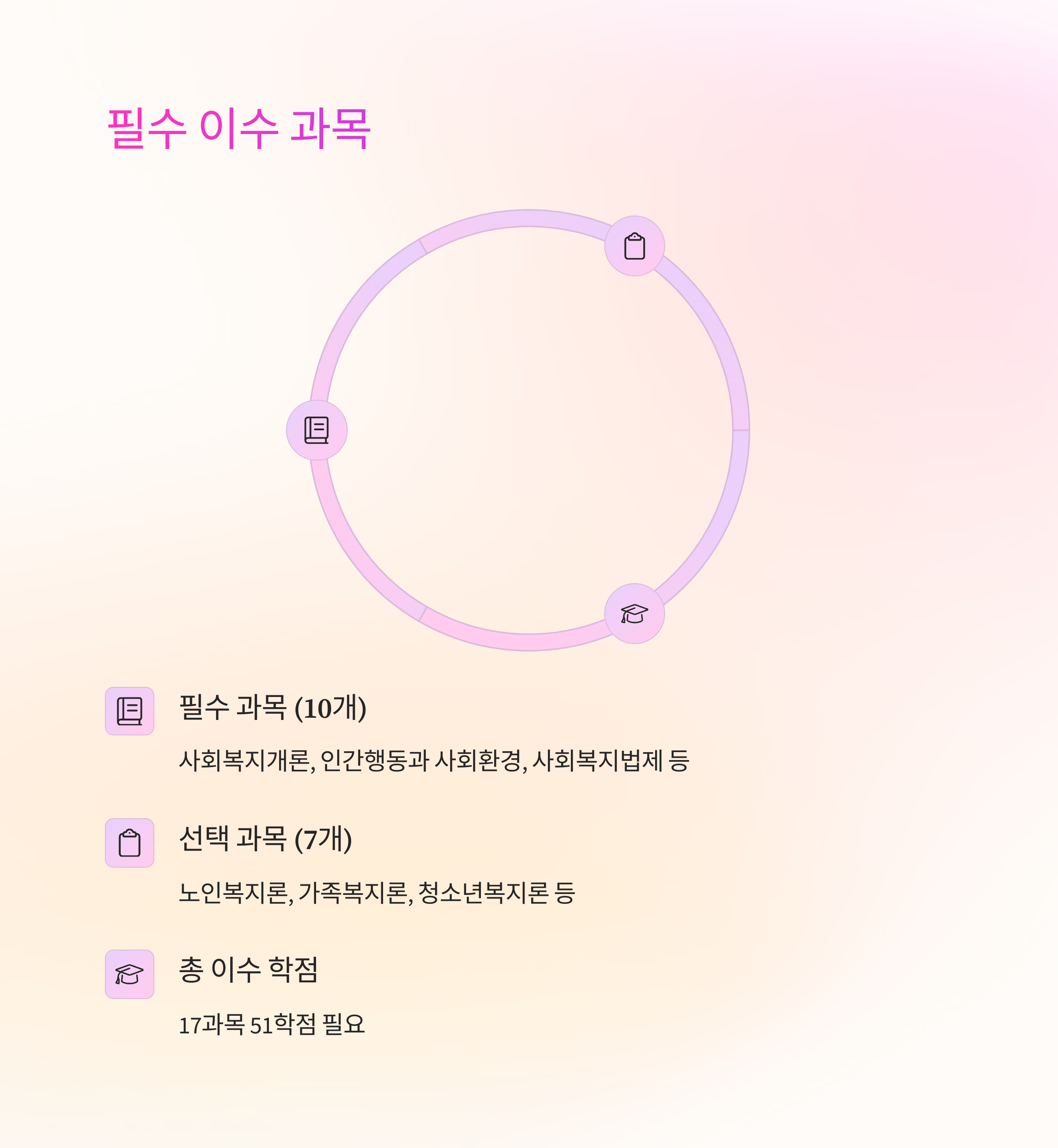 사회복지사 2급을 취득하려면 총 17과목(51학점)을 이수해야 해요. 그중 필수 과목은 10과목, 선택 과목은 7과목으로 구성돼요. 필수 과목은 모두 들어야 자격 심사에서 인정되기 때문에 누락 없이 계획하는 것이 매우 중요해요.