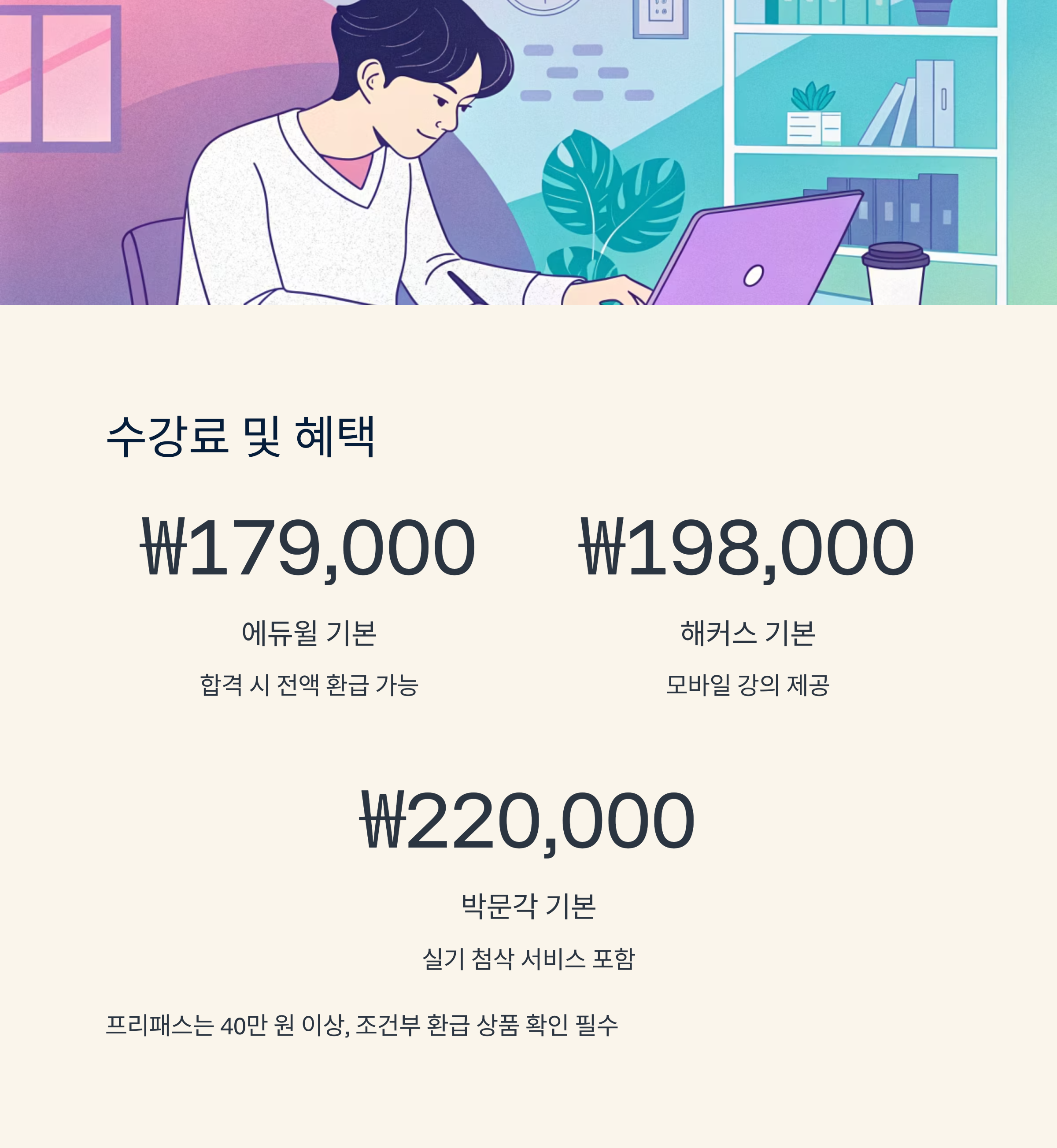 에듀윌은 합격 시 전액 환급 제도를 운영해요. 조건이 조금 까다롭지만 성실하게 출석하면 꽤 유리해요. 해커스는 교재 제공과 더불어 모바일 전용 프리패스를 결합해 구성되어 있어요. 특히 얼리버드 할인과 쿠폰 이벤트가 자주 열려서 잘 활용하면 가성비가 좋아요.