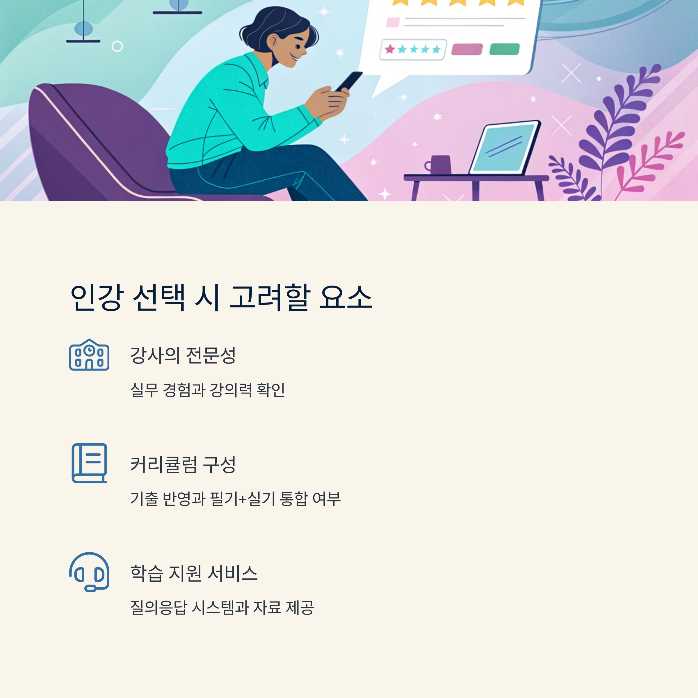 그리고 수험 기간에 따라 선택이 달라져요. 3개월 이상 시간을 확보한 수험생은 커리큘럼이 길고 체계적인 강의가 좋고, 1~2개월 안에 끝내야 한다면 실전 대비 특화 강의를 추천해요. 직장인이라면 모바일 수강 가능 여부도 꼭 확인해야 해요.