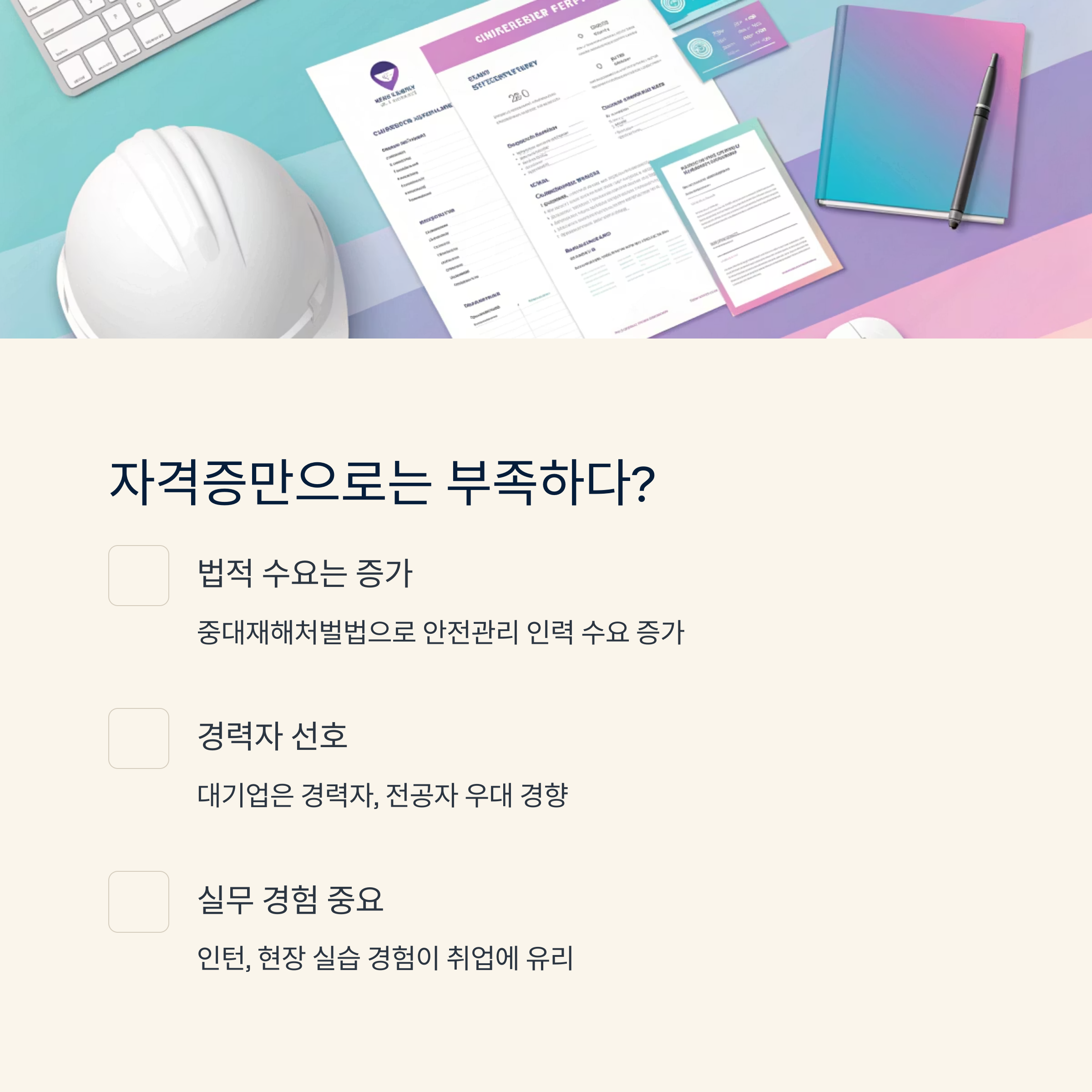 또한 최근에는 산업안전보건법 강화로 인해 현장 채용은 활발하지만, 자격증만으로는 취업이 어렵고 실무 경험이 중요한 평가 요소로 작용하고 있어요. 그래서 자격증과 함께 인턴, 현장 실습, 유관업무 경력이 병행되는 게 유리해요.