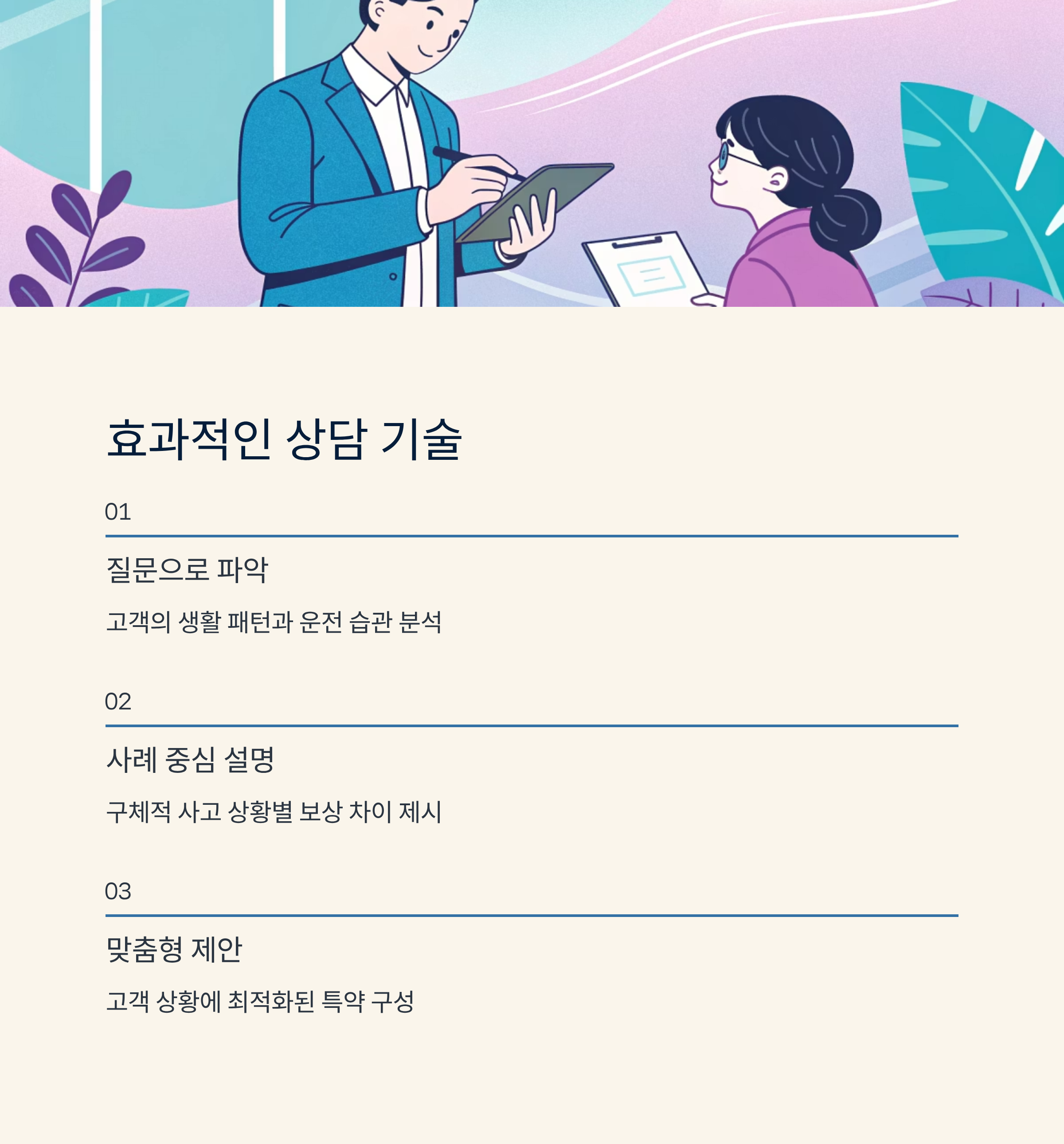 또한 상담 과정에서는 질문을 통해 고객의 생활 패턴을 파악하는 것이 좋아요. 예를 들어 출퇴근 거리가 긴 고객은 장거리 운전자 특약을, 초보 운전자는 사고처리 지원 서비스가 포함된 설계를 선호해요. 이런 방식은 단순히 ‘보험료가 싸다’는 논리보다 훨씬 고객 마음을 움직여요.
