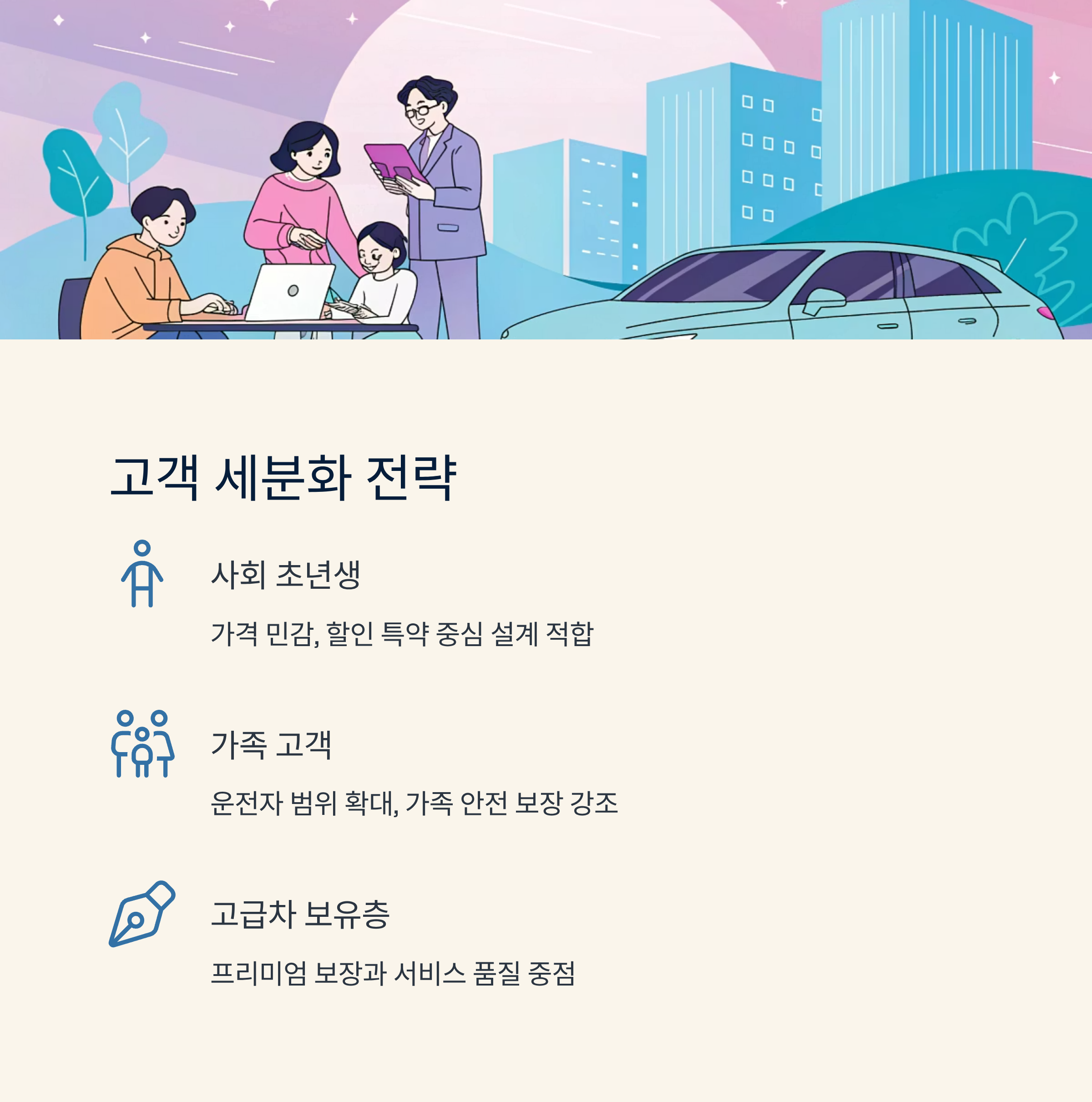 고객을 세분화하지 않고 무작정 자동차보험을 권유하는 방식은 효과가 떨어져요. 예를 들어 사회 초년생, 자녀를 둔 40대, 고급 차량 보유층 등 고객 그룹별로 위험 인식과 보장 니즈가 달라요. 사회 초년생은 가격에 민감하므로 할인 특약 중심의 설계가 적합하고, 가족 단위 고객은 운전자 범위 확대와 가족 안전 보장이 강조되어야 해요.