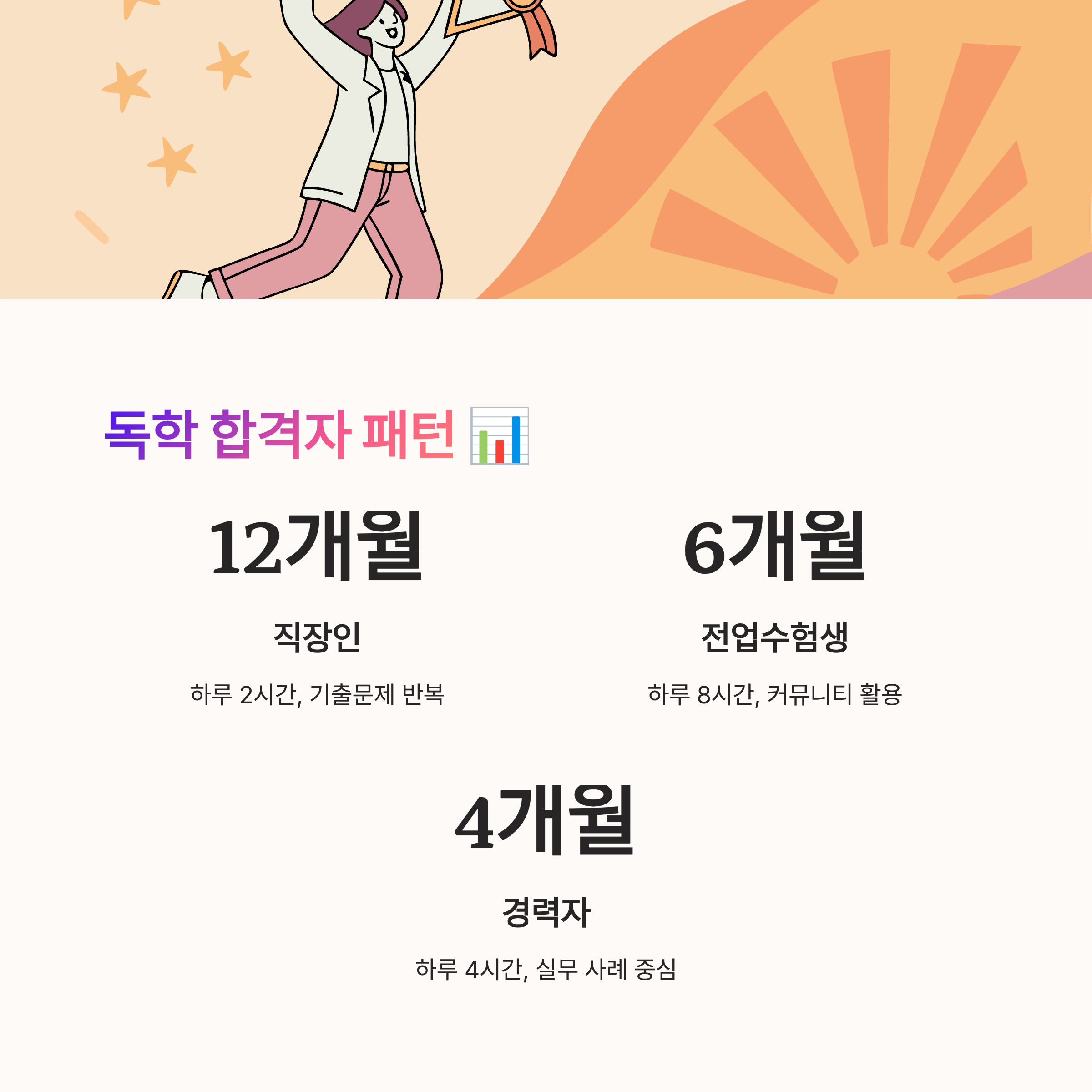 | 전업 수험생 B | 6개월 | 8시간 | 커뮤니티 활용 |