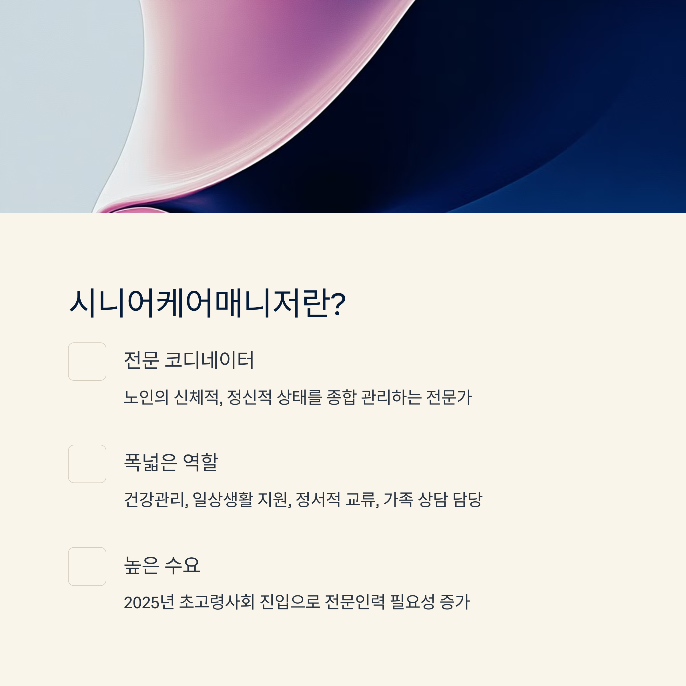 시니어 인구가 급속도로 증가하면서 고령자를 위한 전문 돌봄이 어느 때보다 중요한 시대가 되었어요. 특히 2025년 기준으로 대한민국은 초고령사회로 접어들면서 고령자 복지를 담당할 전문 인력이 절실히 필요해지고 있답니다. 그중 '시니어케어매니저'는 노년층의 삶의 질을 높이는 데 있어 중요한 역할을 하는 자격이에요.