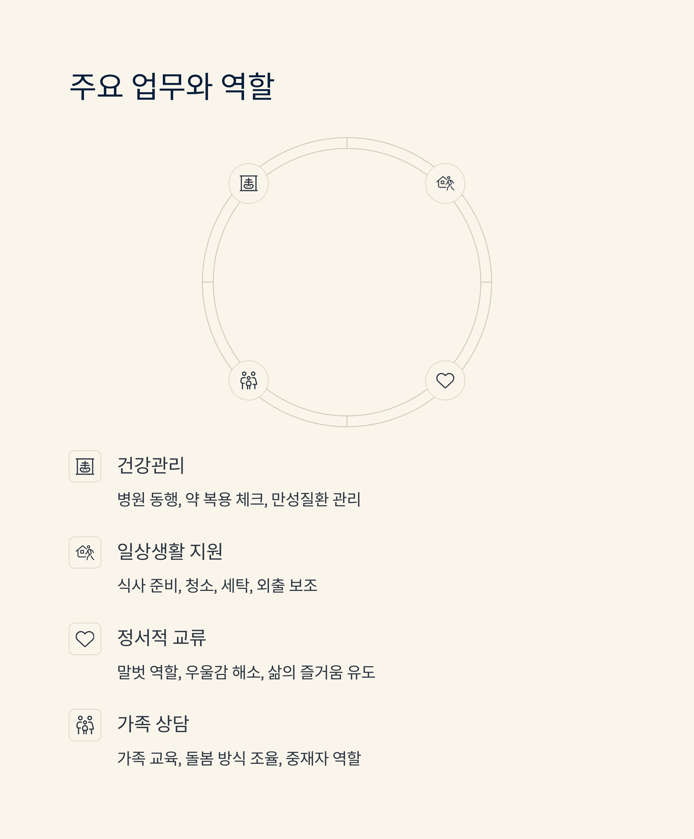 첫째, 건강관리 측면에서는 병원 방문 동행, 약 복용 체크, 만성질환 관리 상담 등을 맡아요. 고령자의 건강은 자칫 방심하면 큰일로 이어질 수 있기 때문에 주의 깊은 관찰이 필요하죠.