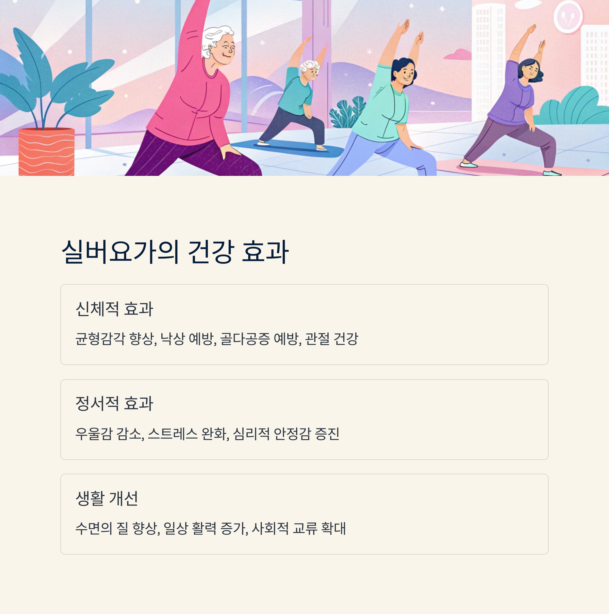 실버요가가 고령자에게 주는 건강 효과는 단순히 근육 강화나 유연성 향상에 그치지 않아요. 신체적 안정뿐 아니라 정서적 안정까지도 아우르는 전인적 웰빙 프로그램이기 때문에, 60대 이상 연령층에게 매우 큰 효과를 보여준답니다.