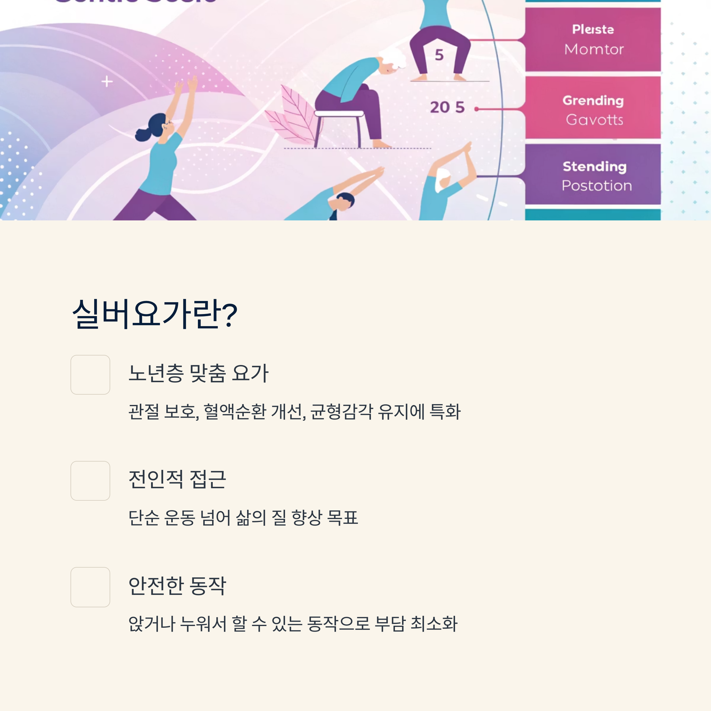 특히 고령자의 근육량 감소, 관절 마모, 골다공증, 낙상 위험 등을 예방하기 위해 맞춤 설계된 동작들이 실버요가에 포함돼 있어요. 단순한 스트레칭이나 운동을 넘어서, 삶의 질을 높여주는 전인적 접근이 특징이에요.